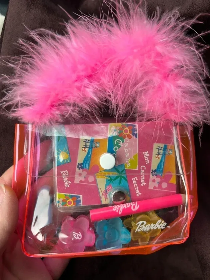 Lot Barbie vintage : petit sac rose plume + carnet secret + crayon + barrettes