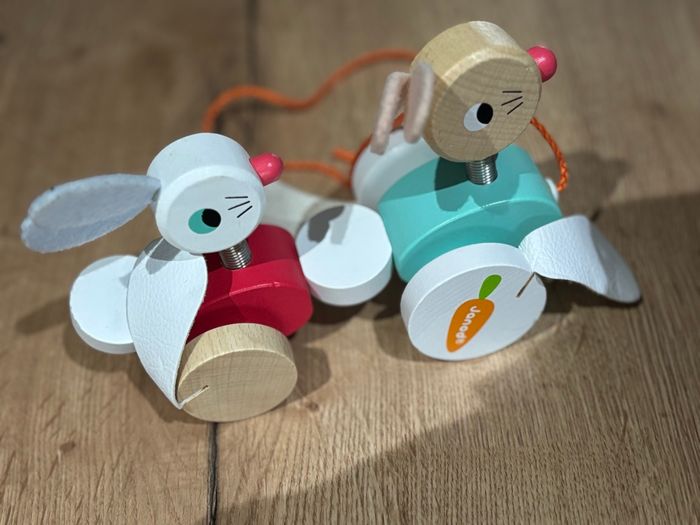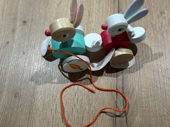 Jouet en bois pour enfant, idéal dès 1 an. Deux petits lapins articulés montés sur roues avec une corde à tirer orange. Coloris doux (vert menthe, rouge, bois naturel, blanc). Très bon état, sans casse ni éclats. Parfait comme premier jouet à tirer ou pour compléter une collection de jouets en bois. Matière : bois + tissu pour oreilles. Dimensions approximatives : env. 15 × 8 × 10 cm.