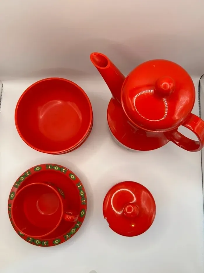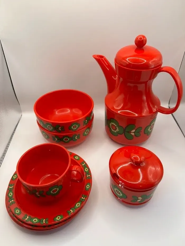Lot de vaisselle EMSA Power Flower, fabrication Made in Germany. Ensemble comprenant : • 1 cafetière / verseuse • 1 tasse avec 3 sous-tasse • 2 bols • 1 sucrier avec couvercle Motif floral emblématique Power Flower, très recherché pour son style rétro années 70.