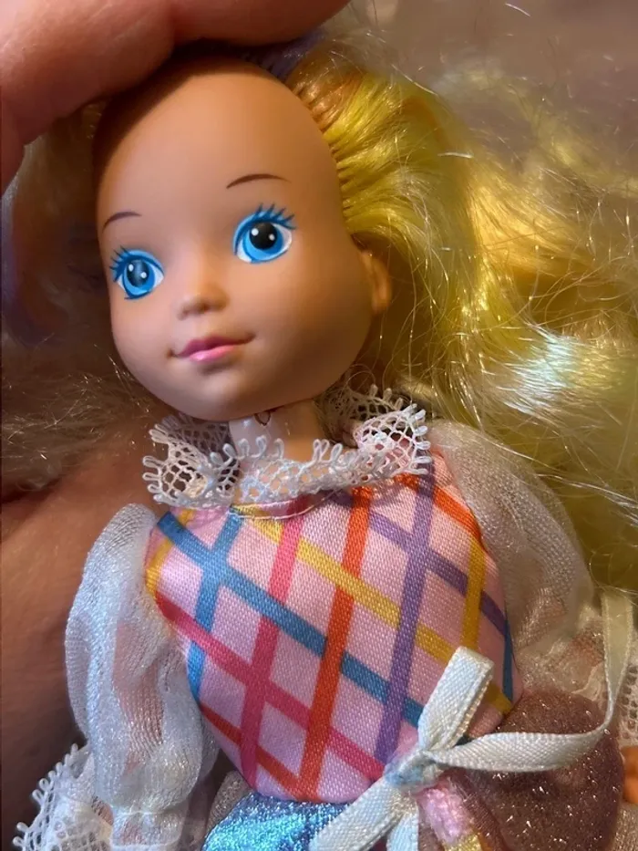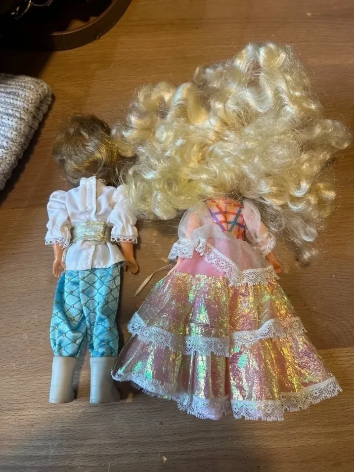Lot de 2 poupées vintage comprenant : • Dame Boucleline (Mattel, années 80/90) avec sa belle robe irisée et ses longs cheveux blonds bouclés. Animée au niveau du cou, voir photos. • Son prince assorti, vêtu de sa tenue d’époque : chemise blanche à dentelle, ceinture dorée et pantalon bleu à motifs. Les deux poupées sont en bon état général, avec leurs vêtements d’origine. Cheveux légèrement à recoiffer, mais belles couleurs conservées. Poupées issues de la célèbre gamme “Lady Lovelylocks / Dame Boucleline et ses amis” très appréciée des collectionneurs. Vendues ensemble.