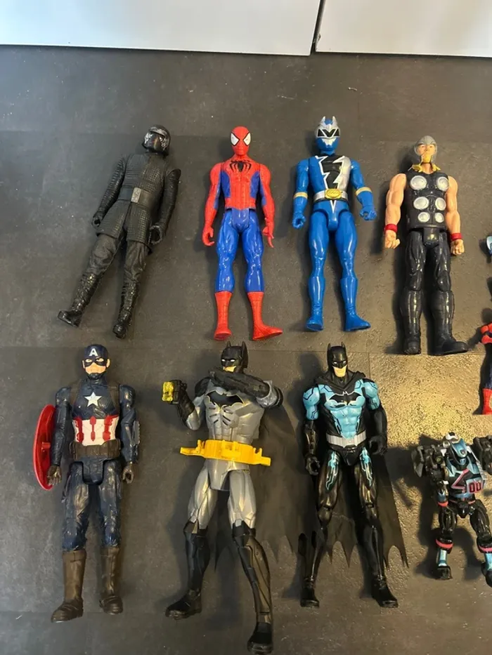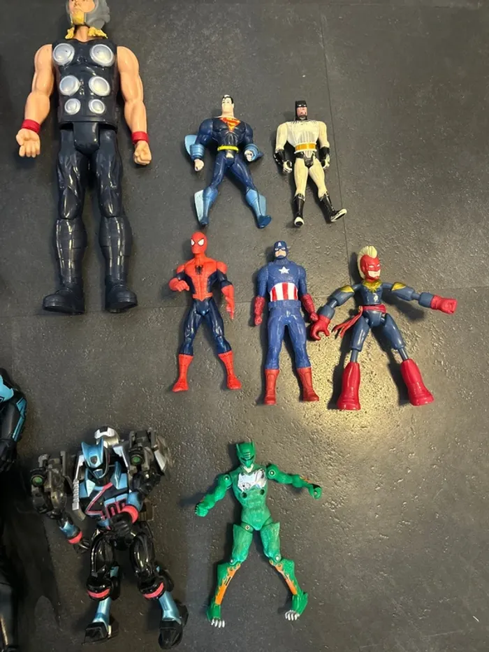 Lot de figurines Marvel & Power Rangers comprenant plusieurs personnages connus : Captain America, Spider-Man, Thor, Batman, Power Rangers et autres super-héros. - Figurines de différentes tailles - Univers Marvel et Power Rangers - Jouets solides, traces d’usage normales liées au jeu - Idéal pour jouer, compléter une collection ou faire plaisir à un enfant fan de super-héros
