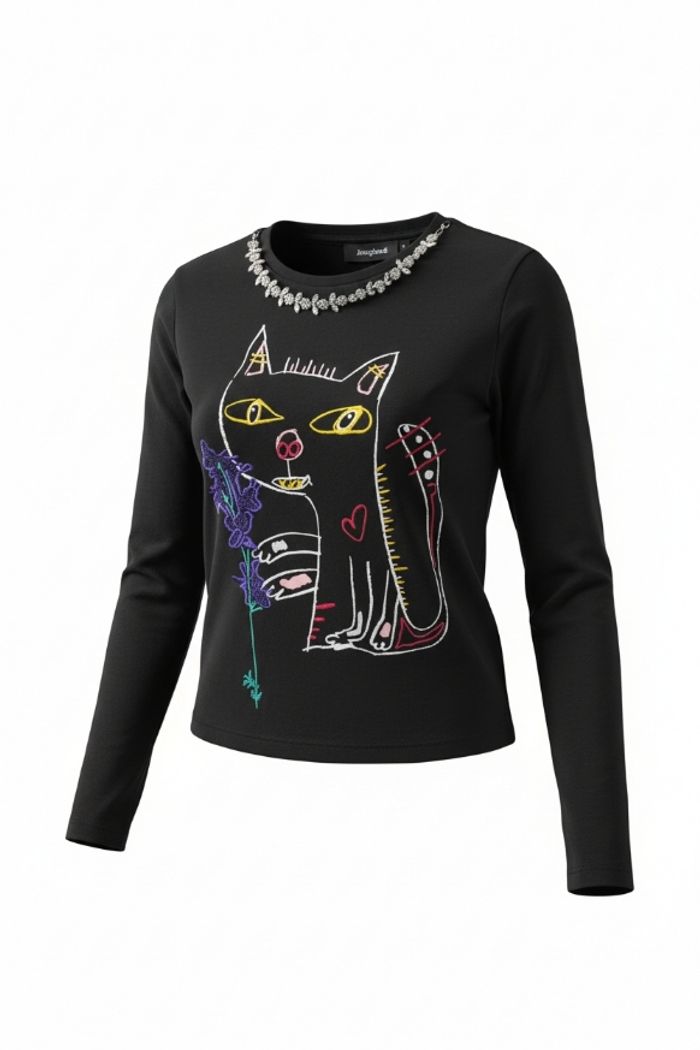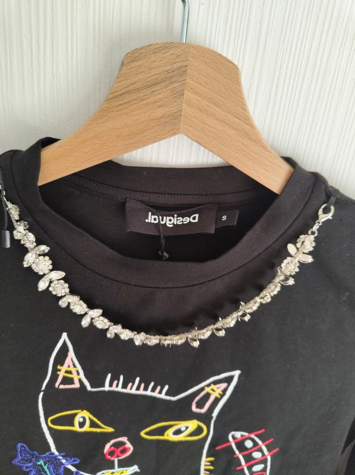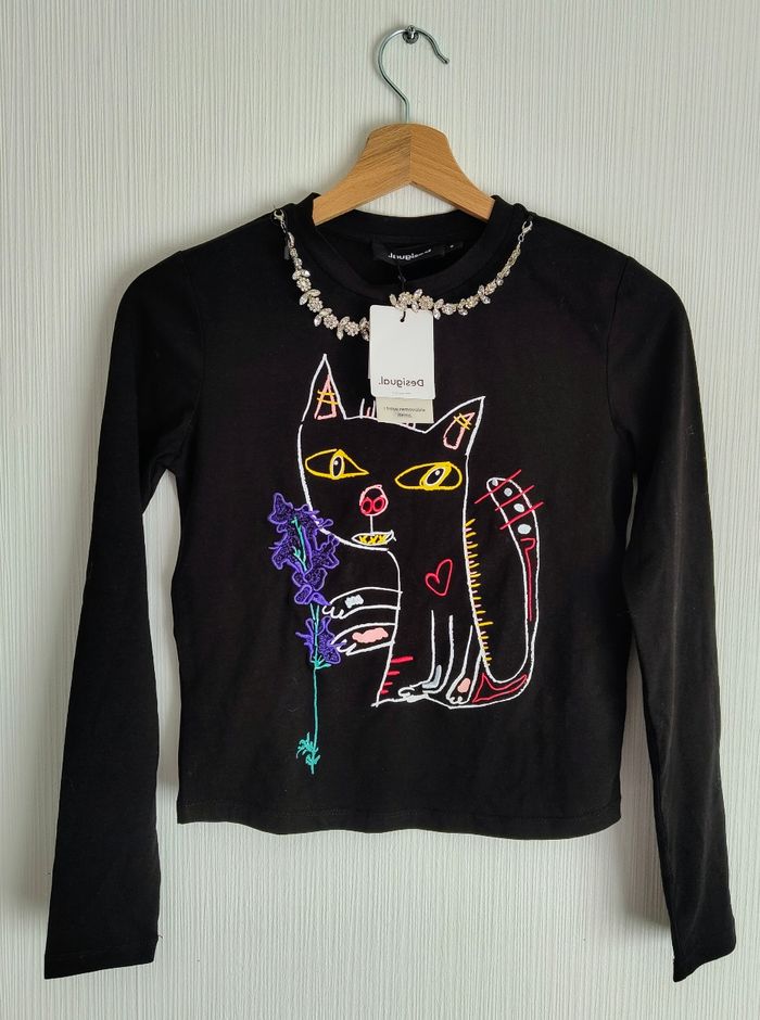 👩 T-shirt à manches longues, imprimé chat avec fleur en relief. Le "collier" peut se détacher. 👩 Taille S 👩 Marque : Desigual 👩 Matière : 96% Coton 4% Élasthanne 👩 Neuf avec étiquette.