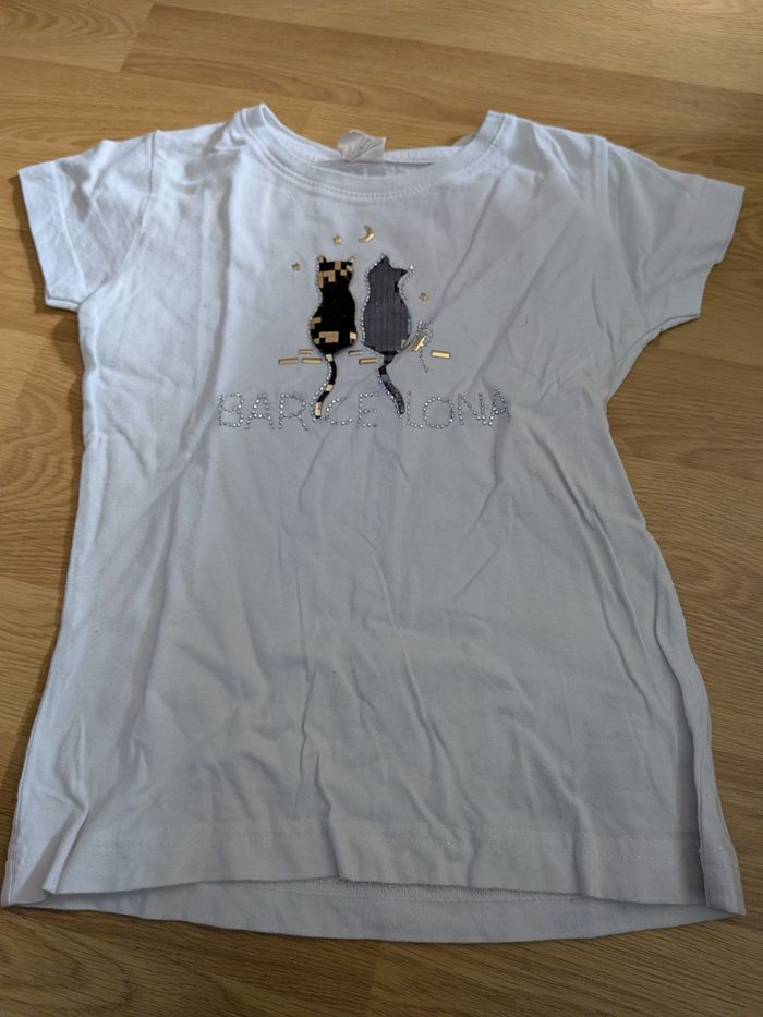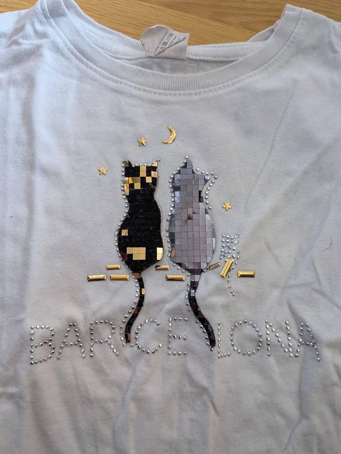 Adorable t-shirt blanc à manches courtes de la marque Roly, avec un design original et scintillant. Design : Illustration de deux chats assis dos à dos sous la lune et les étoiles. Détails scintillants : Le motif est décoré de carreaux brillants (dorés et argentés) et du mot "BARCELONA" écrit en petits strass. Matière : 100% coton, pour un confort optimal et une maille respirante. Taille : 3-4 ans (Kids 3/4). Marque : Roly (Gor Factory). État : Bon état général, les éléments décoratifs sont bien en place. Conseils d'entretien : Lavage à 40°C maximum. Pour préserver les strass et les motifs brillants, je recommande un lavage sur l'envers ou dans un filet de protection. Maison non-fumeur. Envoi rapide