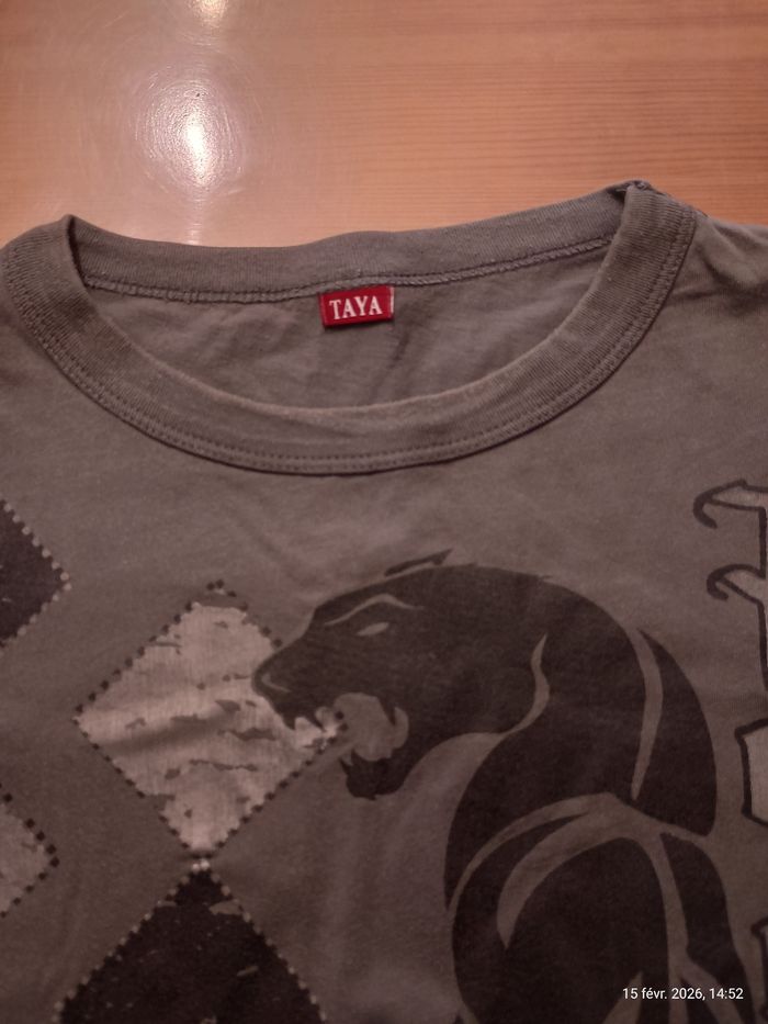 Je vends ce t-shirt gris homme de la marque Taya. - Type de produit : T-shirt - Taille : M (mais de coupe courte) - Couleur : Gris / Anthracite - Caractéristiques : Imprimé graphique N'hésitez pas à me contacter pour plus d'informations ou de photos.