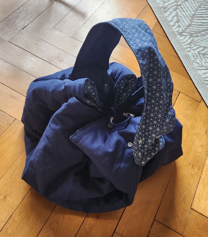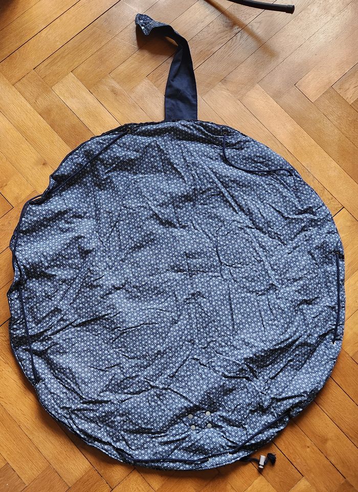 Sac à jouets avec anse et cordons qui se transforme en un tapis d'éveil de 90 cm de diamètre. Très pratique pour emporter les jouets de bébé partout. Maison non fumeur et sans animaux.