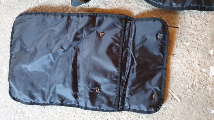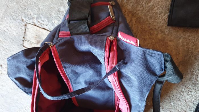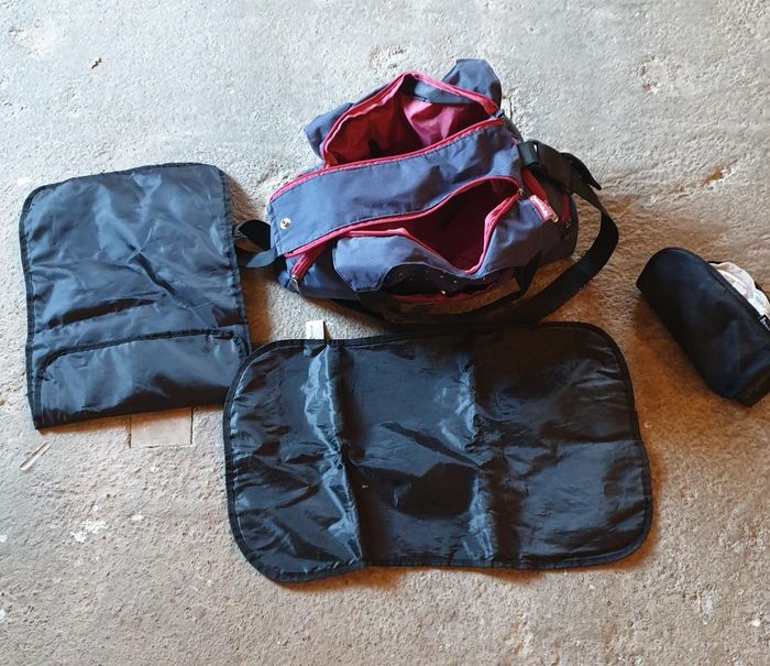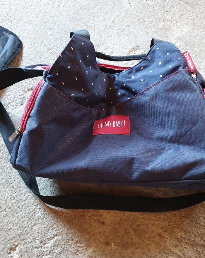 Sac à langer badabulle "Oh my baby" (la lanière qui tient les 2 fermetures éclairs qui ouvrent le sac est décrochée, voir photo. A réparer mais ne gêne pas l'utilisation). Contient un tapis de change, un sac pour les affaires sales et autres, une pochette isotherme Maison non fumeur et sans animaux