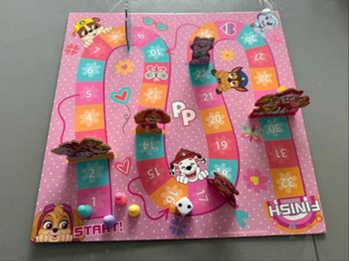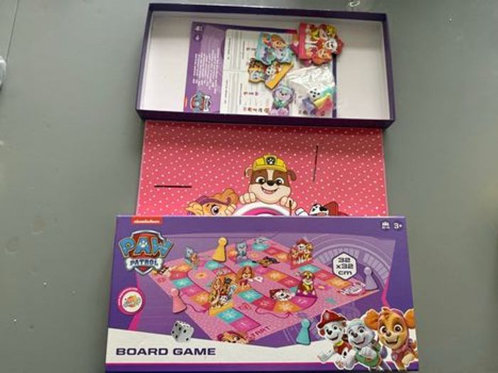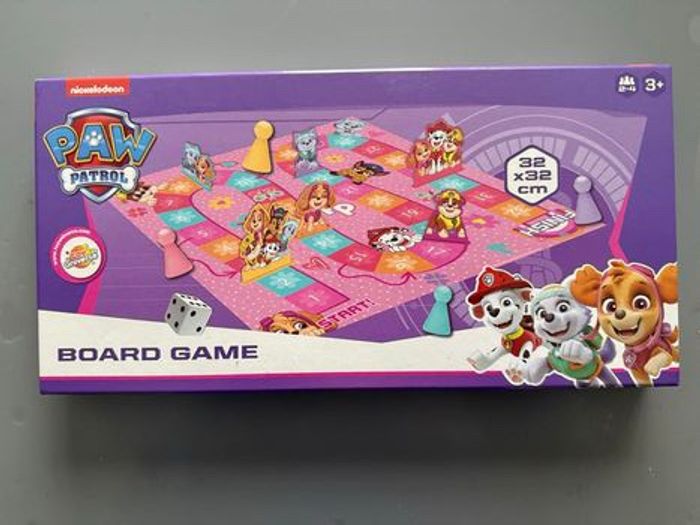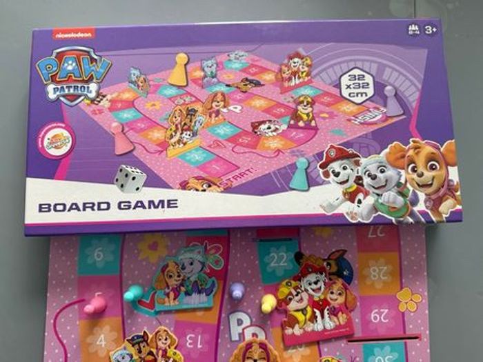 Jeu de société de plateau Pat' Patrouille - Board Game Jeu de plateau Pat Patrouille complet à partir de 4 ans contient : - Un Plateau carré (environ 33 × 33 cm) • 4 pions triangulaires : • un jaune • un rose • un mauve • un vert • un Dé blanc • 6 figurines à l'effigie de la célèbre Pat Patrouille en carton et à insérer au niveau du plateau pour le jeu • une notice Règles très simples (jeu de parcours) De 2 à 4 joueurs Parfait pour les fans de la Pat' Patrouille Très bon état complet avec boîte comme neuf