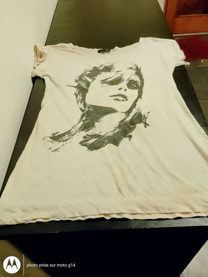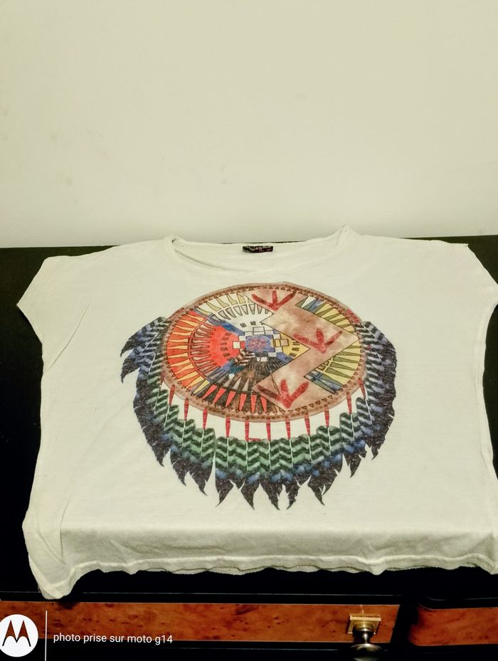 - 1 maillot manches mi-longues, blancs avec des rayures de fleurs bleues, bas en dentelle - Bershka TS - 1 Tee-shirt de sport rose, doublé blanc, sans manches Cécilia Classic T38 - 1Tee-shirt blanc long, décoré d'un visage de femme Kiabi T38 - 1 blanc, décoré d'un motif indien - Les feus de la mode T38 1 petit haut noir, petites manches, boutons sur le devant - Jennyfer TXS - 1tee-shirt blanc, décoré d'une bouteille, sans manches.