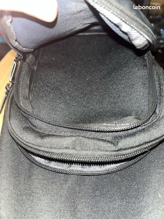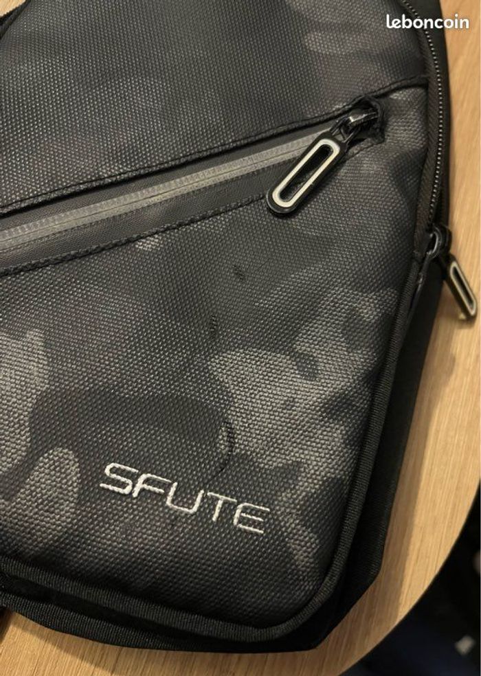 Je vends cette pochette noire de la marque Sfute. - Type de produit : Pochette - Univers : Homme - Couleur : Noir - Fonctionnalités : Bandoulière réglable, Multiples poches zippées (3) Bon état : petites traces d’usure sur le devant N'hésitez pas à me contacter pour plus d'informations.