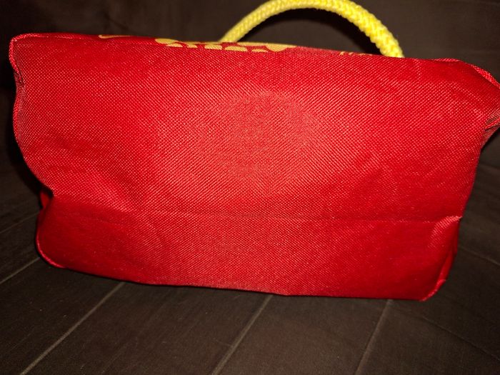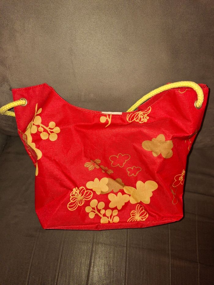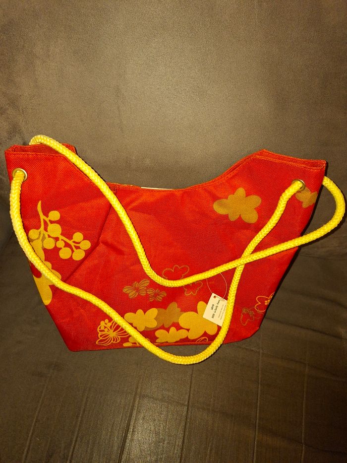 Ajoutez une touche de peps à votre quotidien avec ce joli sac compact aux couleurs estivales. Sa couleur rouge vive et ses motifs de fleurs et papillons dorés en font un accessoire à la fois gai et élégant. ​Les détails qui font la différence : ​Format compact et logeable : Parfait comme sac d'appoint, sac à déjeuner ou pour transporter vos produits de beauté. ​Sécurité : Fermeture pratique par une bande velcro centrale pour accéder rapidement à vos affaires. ​Confort : Deux anses en corde jaune tressée, douces et robustes, pour un porté main ou avant-bras. ​Finition : Fond large offrant une belle stabilité une fois posé. ​Caractéristiques techniques : ​Dimensions : 29 cm (longueur) x 22 cm (hauteur) x 15 cm (profondeur). ​Couleur : Rouge dominant, motifs or/jaune, anses jaunes. ​État : Très propre, intérieur rouge uni impeccable.