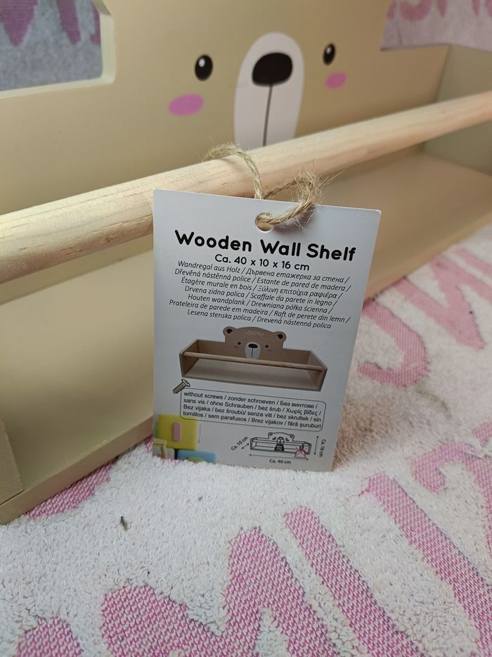 Adorable étagère murale en bois avec motif ours, parfaite pour une chambre d’enfant ou de bébé 🧸 Idéale pour ranger des petits livres, décorations ou accessoires. Caractéristiques : Matière : bois Dimensions : env. 40 x 10 x 16 cm Couleur : beige / naturel Motif : ours État : neuve, avec étiquette Facile à fixer au mur Parfaite pour une décoration douce et mignonne dans une chambre d’enfant. Maison non-fumeur. Envoi rapide et soigné 📦