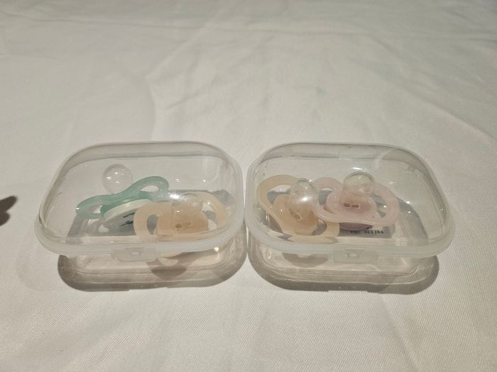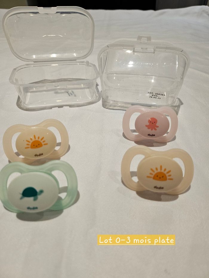 Lot de 4 sucettes/tétines plate âge 0-3 mois de Dodie. Deux boîtes de stérilisation. Jamais utilisées, juste stérilisées.