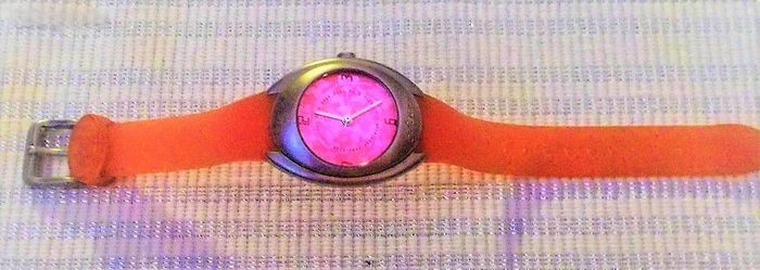 Montre "Oxbow", boîtier en métal argent à intérieur rose, aiguilles rose, et bracelet en silicone rose, fonctionnante, pile non fourni, prix définitif.