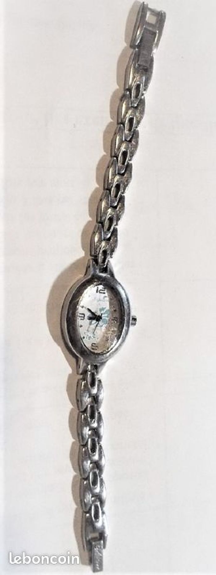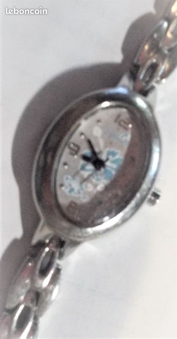 Montre "OXBOW", boîtier ovale en acier argenté, intérieur blanc à motif fleur bleu, chiffres, aiguilles et trotteuse argent, bracelet métal argenté, pour petit poignet 23 cm d'un côte à l'autre, bé, fonctionnante, pile non fourni, prix définitif.
