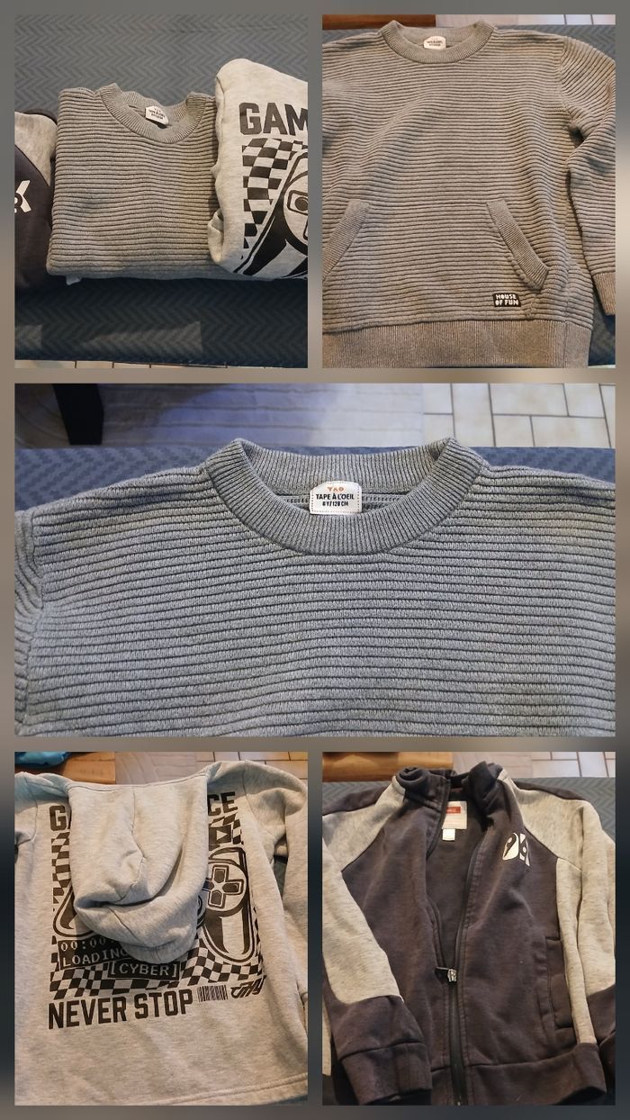 Lot de 19 t-shirts manches longues 8 ans certains neufs sans étiquettes d'autres peu porté ou tbe. Lot 3 pulls et 1 gilet 8 ans Tout laves et bon état, de toutes marques,