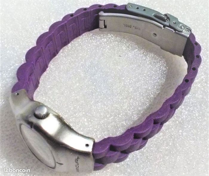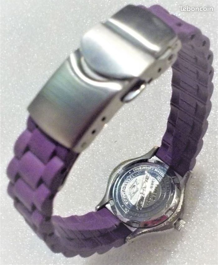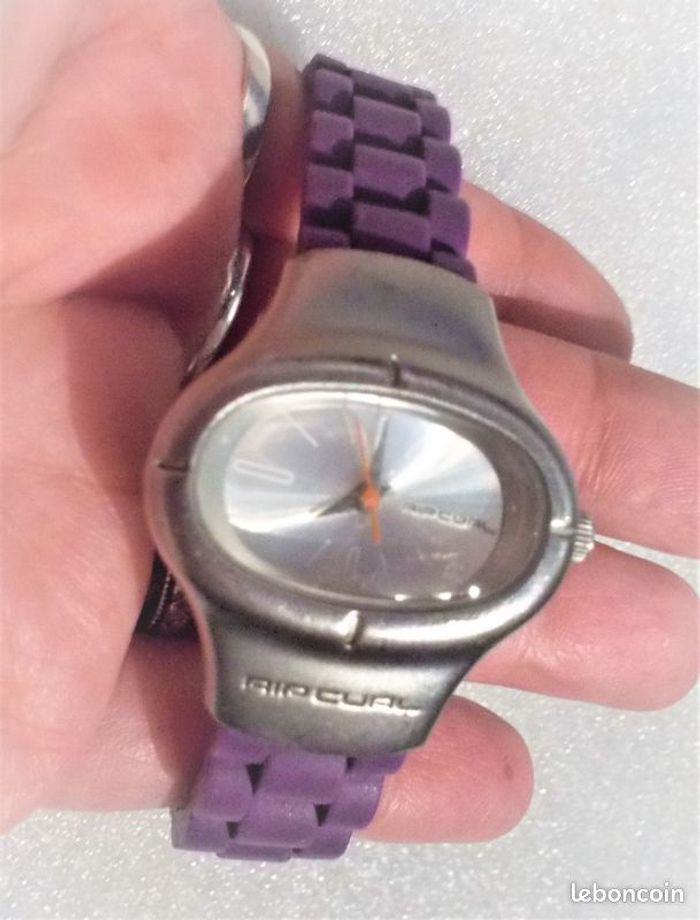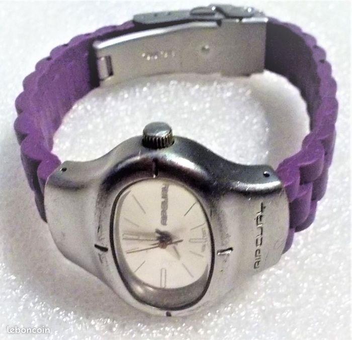 Montre RIP CURL "Classic Surf Watch", boîtier en acier argent polie de forme très original, intérieur argent, aiguilles argent et trotteuse orange, et bracelet silicone couleur violet, fermeture à ardillon, en parfait état de fonctionnement, pile fourni, prix définitif.