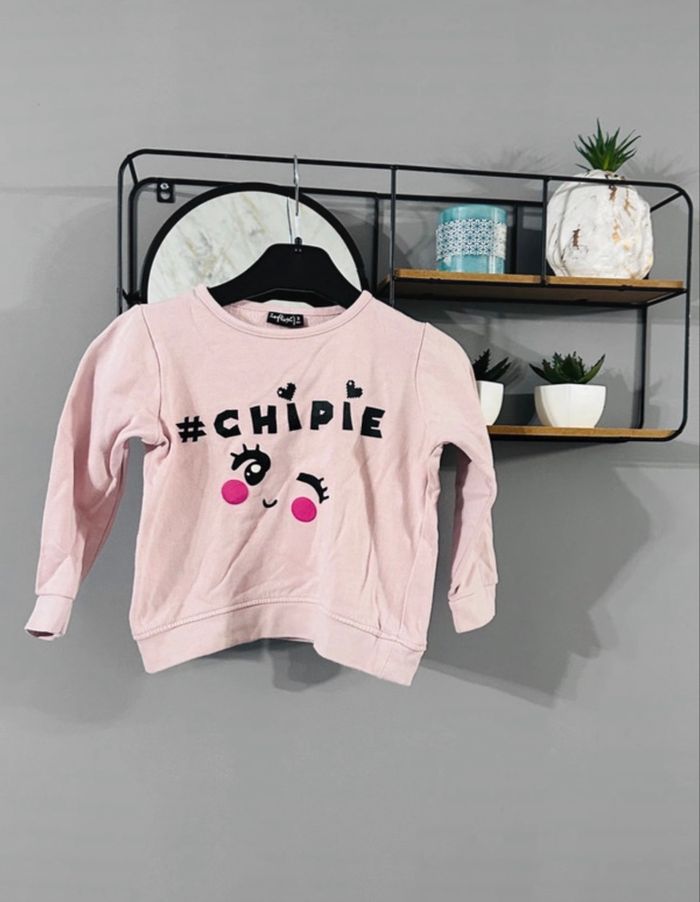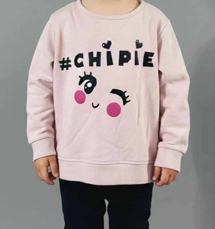 adorable sweat à manches longues de couleur rose poudré. • Inscription ludique "#CHIPIE" avec un petit visage clin d'œil trop craquant. • Finitions bord-côte aux poignets et à la taille pour un bon maintien. • Très bon état. Un haut confortable et plein de peps pour les petites chipies !