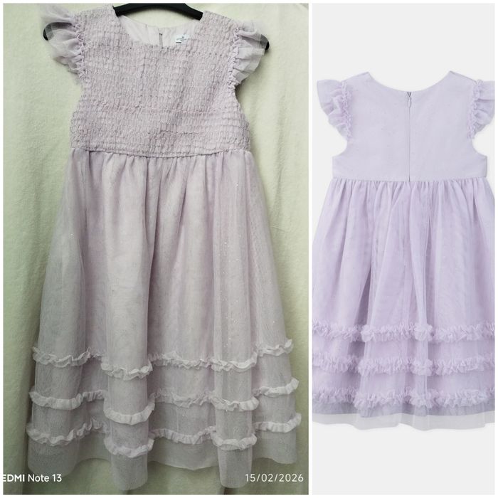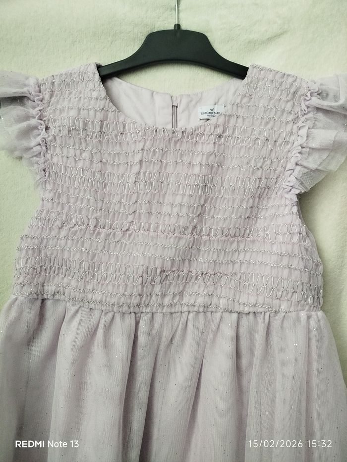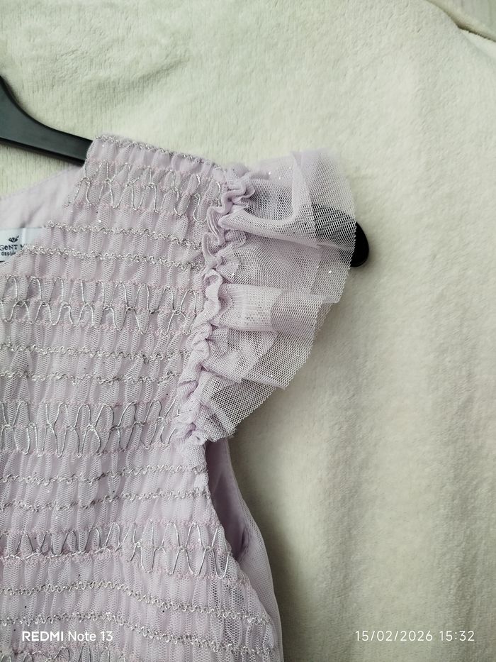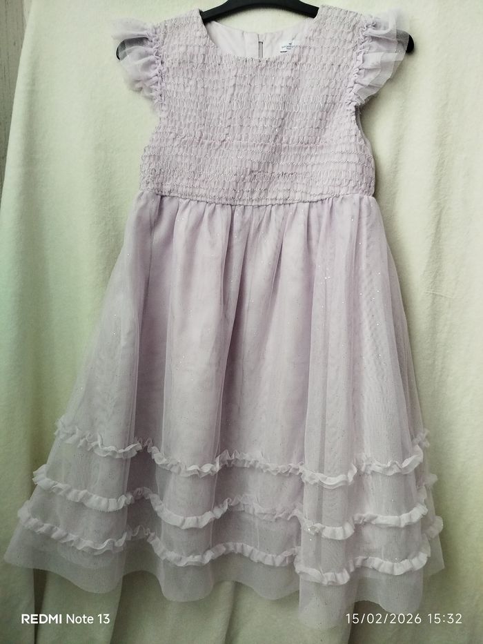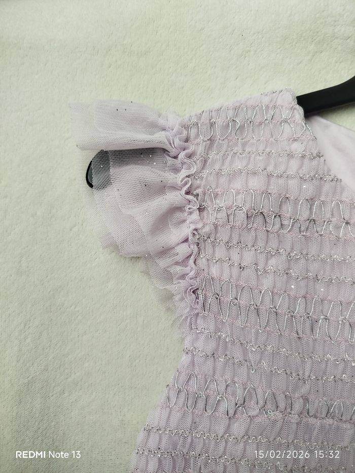 Portée une seule fois, pendant une seule soirée, donc quasi neuve. Robe de cérémonie en tulle pailleté, légère et aérienne, sans manches, parfaite pour les occasions festives. Doublure confortable en coton, jupe en tulle qui apporte un joli volume. Couleur : Parme / lilas