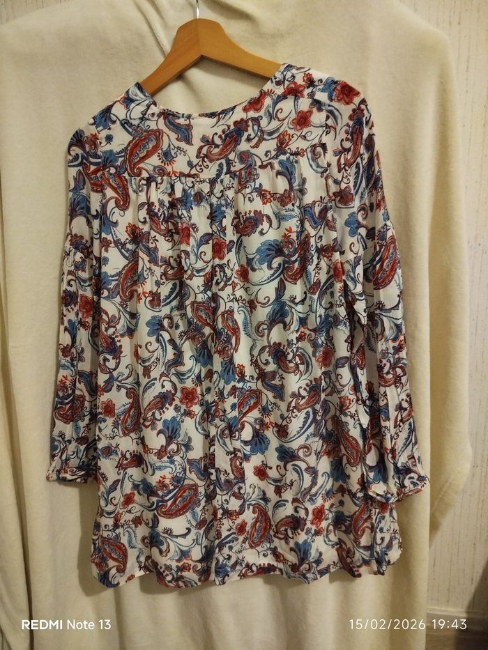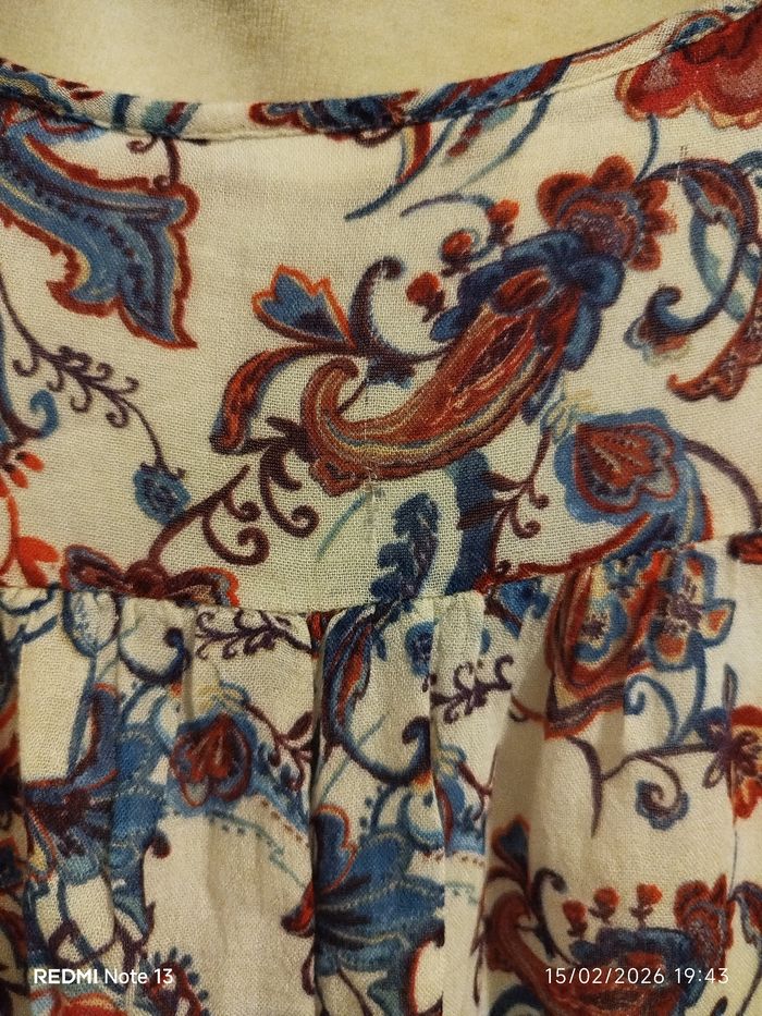 Jolie robe à imprimé rouge et bleu, confortable et facile à porter. Manches larges Tissu texturé effet lin Doublure intérieure Poches latérales Coupe confortable À noter : petit fil tiré au dos ayant créé un minuscule accroc dans le tissu. Cela reste très discret et peu visible avec l’imprimé.