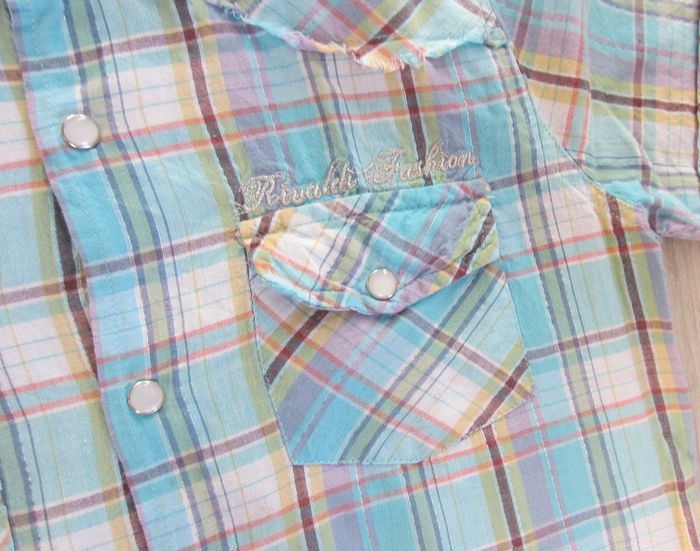 Chemisier ton bleu. Effet effiloché a certains endroits (c'est normal). Broderie au dos. Marque : Rivaldi Fashion. Taille 10 ans.