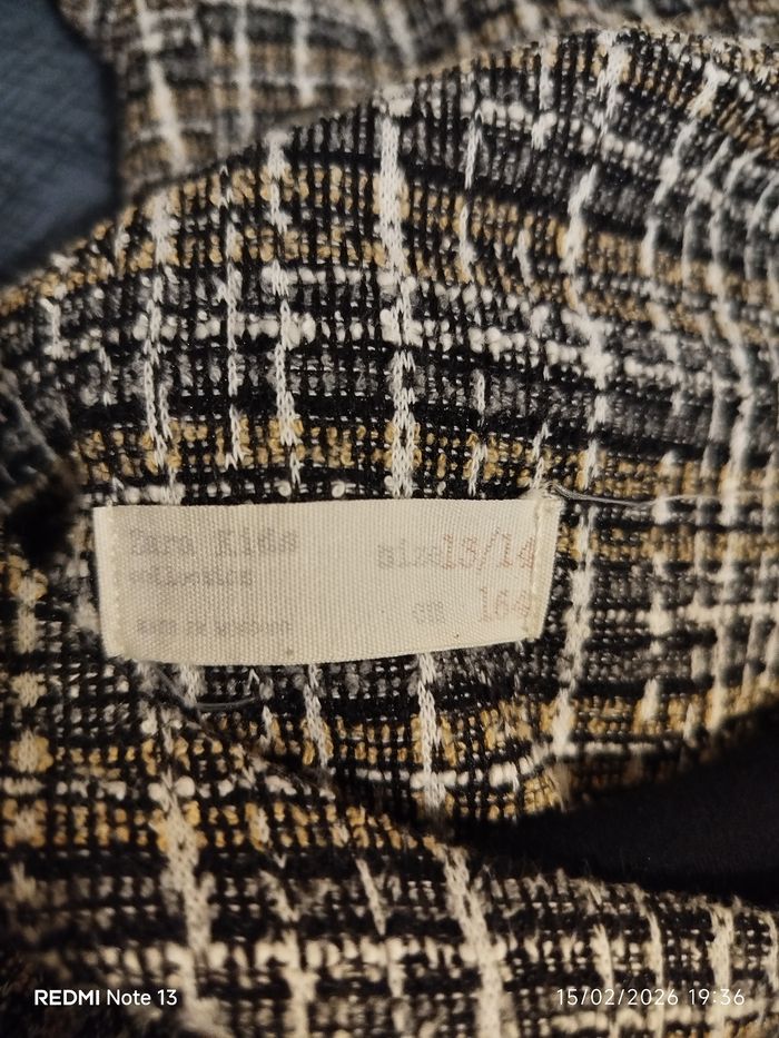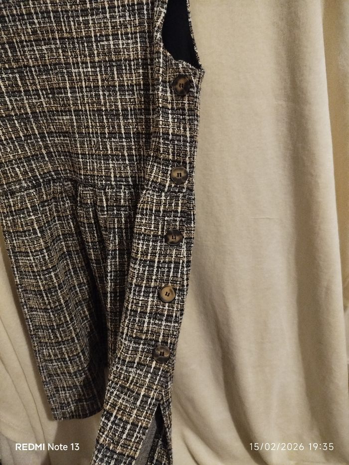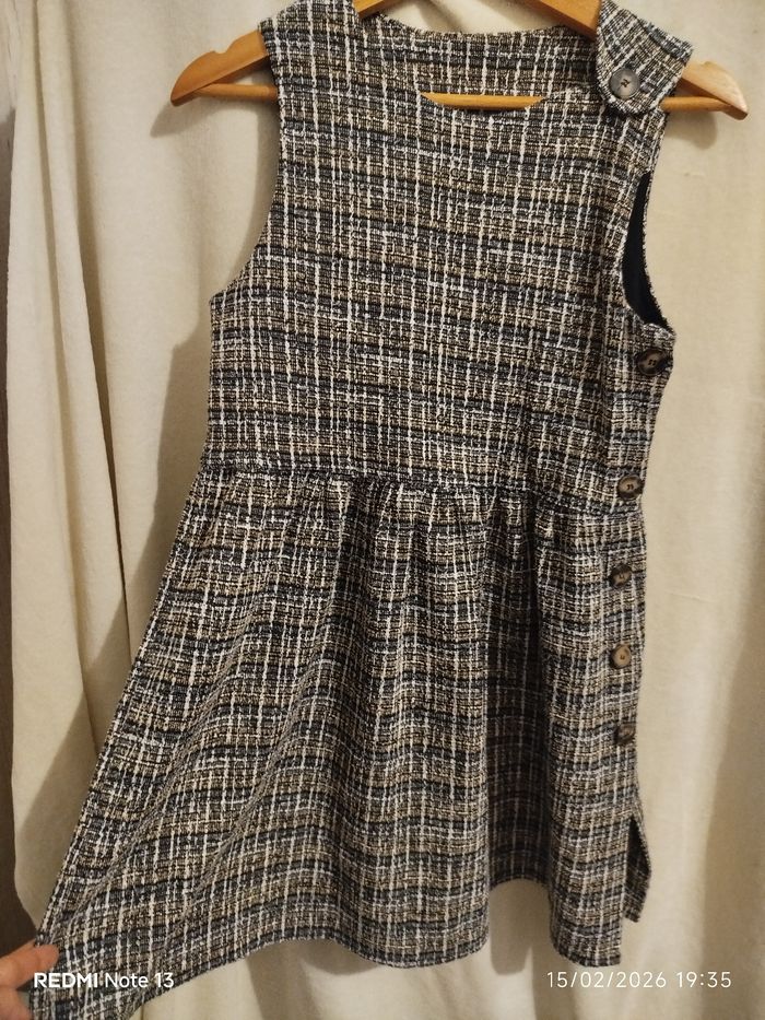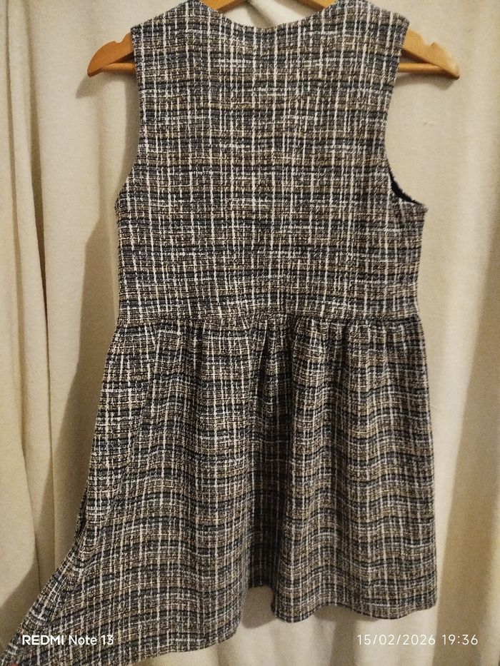 Jolie robe sans manches en tissu à carreaux style tweed, inspiré du tissu emblématique des vestes Chanel. Coupe élégante avec jupe évasée et boutons décoratifs sur le côté