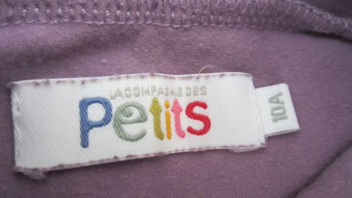 Tee shirt de coloris lilas/violet. Petit col. Dessins aux bras. Taille 10 ans. La compagnie des petits.