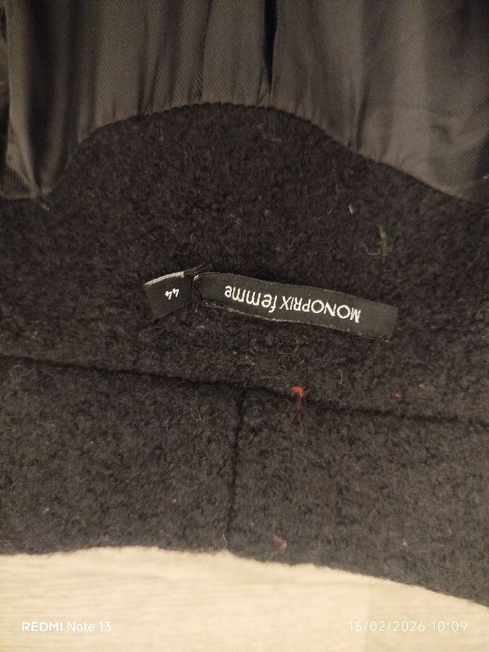 Vends manteau noir mi-long en très bon état, chaud et élégant, idéal pour l’automne et l’hiver. Coupe classique avec col large, fermeture par boutons et doublure intérieure. Très facile à porter au quotidien comme pour une tenue plus habillée. Détails : Taille indiquée : 44 Taille réelle : correspond plutôt à un 38 (voir mensurations sur les photos Matière : lainage (mélange laine/synthétique)