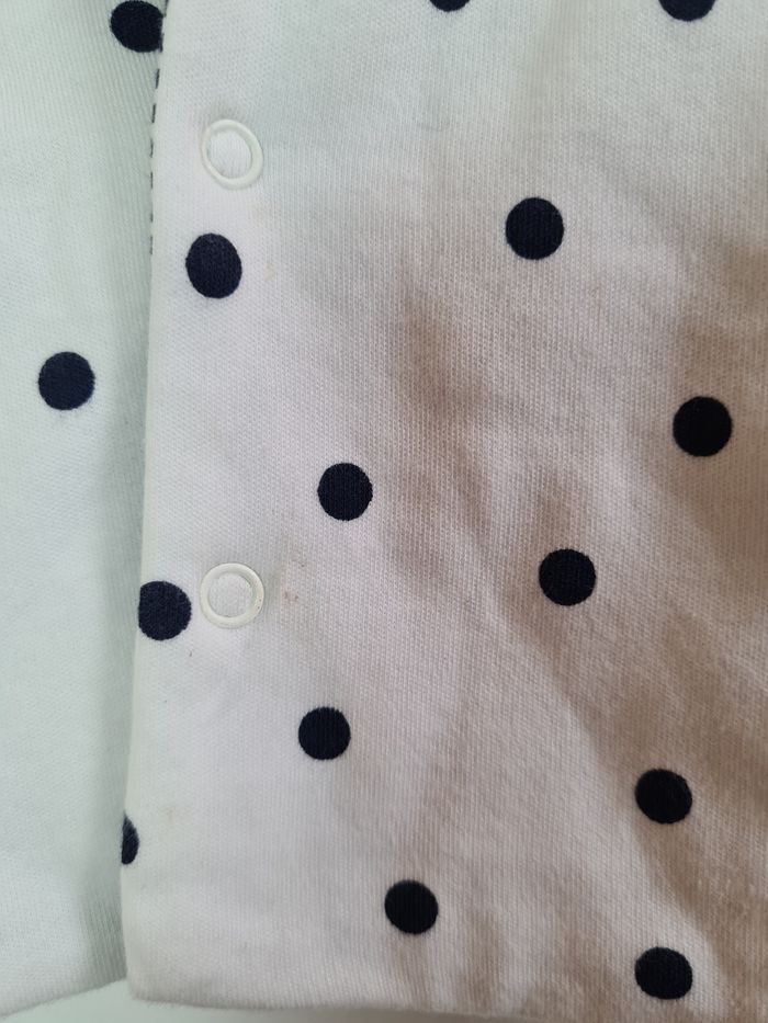 Gilet molleton douillet à capuche, réversible , blanc à pois bleu marine ou rayé bleu et blanc, fermeture pressions, très bon état, petite tâche visible vers pression, voir photo. Absorba, 3 mois.