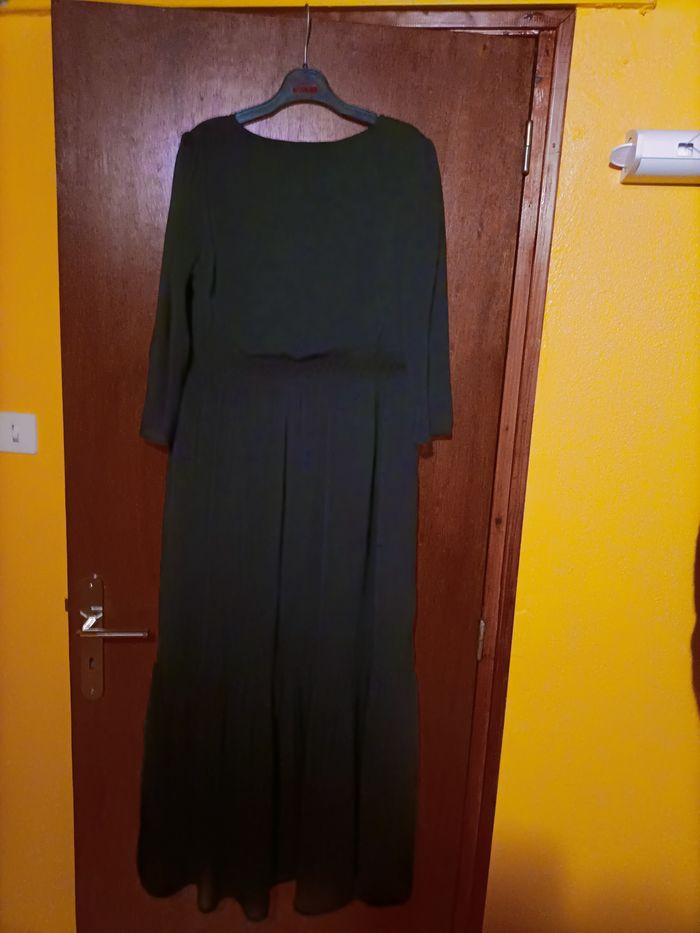 Très jolie robe noir 3/4 manches, mesurant 133 cm, fleurs brodées juste en dessous la poitrine, bande ajourée au-dessus la taille. Taille 40. Idéale pour une soirée. Portée qu'une fois.