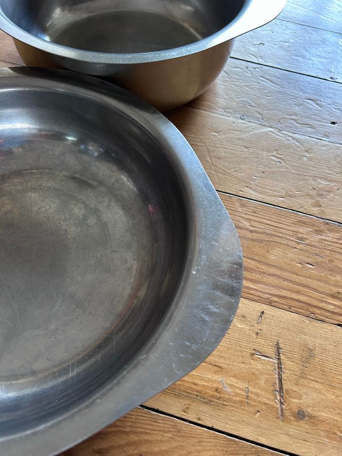 2 saladiers rond en inox avec poignées - diamètre 22 cm hauteur 9 cm - diamètre 24,2 cm hauteur 6,4 cm Les diamètres sont mesurés à l’ouverture sans compter les rebords et les poignées