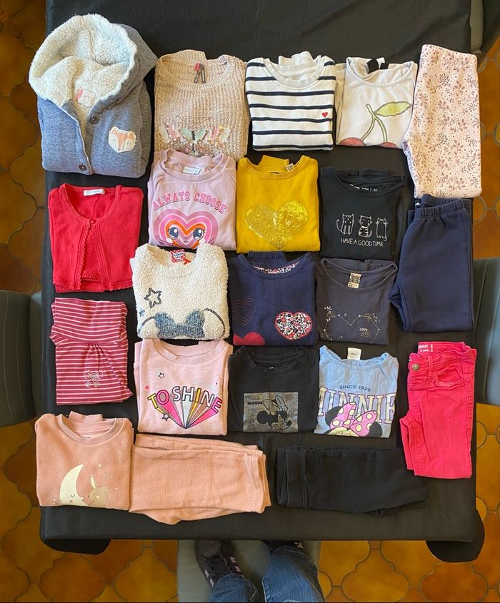 Vend lot de vêtements pour fille taille 4 ans comprenant 20 articles, dont : - 1 veste chaude - 1 pyjama 2 pièces - 1 gilet court manches longues idéal pour accompagner une robe - 1 sous-pull - 7 pulls - 5 t-shirt manches longues - 4 pantalons Très bon état car très peu portés. Marques diverses et variées : #kiabi #disney #gemo #roxygirl #orchestra #okaidi #sergentmajor #tapealoeil #nameit #laet249_fille_4ans #lotdevetementsfille #fille4ans #vêtementsfille4ans #tresbonetat