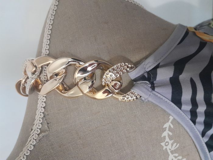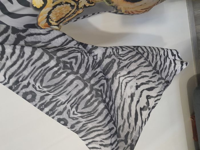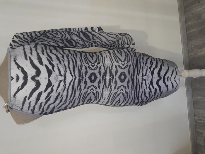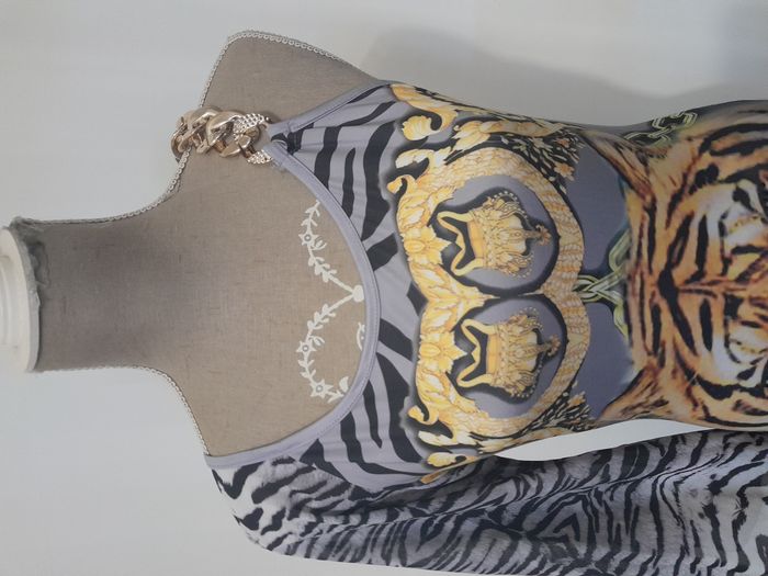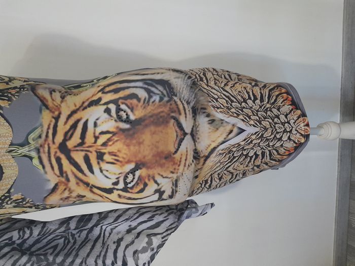 Robe, imprimé lion devant zèbre derrière, 1 manche longue évasé d'un côté, l'autre côté bretelle déco chaine, strass sur le visage du lion Longueur : 83cm Aiss / Aiss : 45cm Matière : 95 % Polyester, 5 % Elasthanne Marque : Angelie