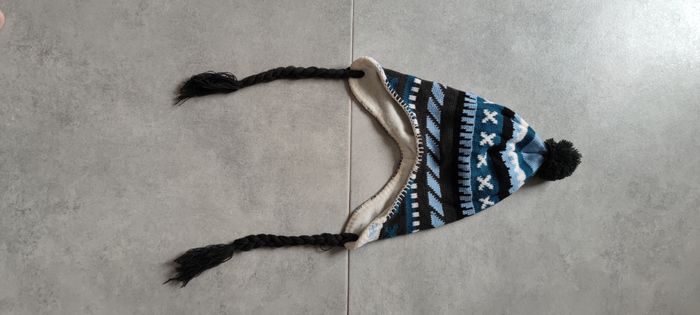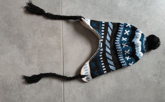 Bonnet de ski style péruvien descendant sur les oreilles. Couleur bleu, noir, gris et intérieur blanc. Deux tresses sur les côtés, pompon sur le haut et intérieur en matière molleton. En excellent état. N'hésitez pas à regarder mes autres ventes, j’essaye de les classer au mieux. Je ne compose pas moi-même les lots pour vous laisser libre choix.