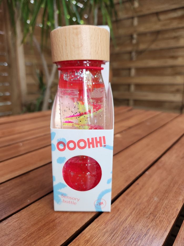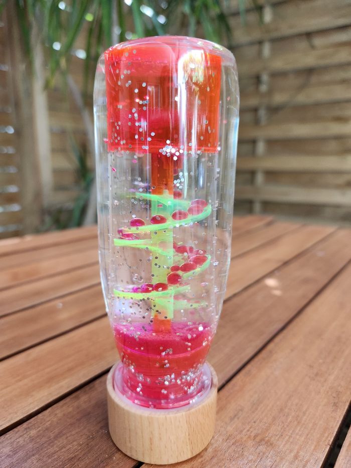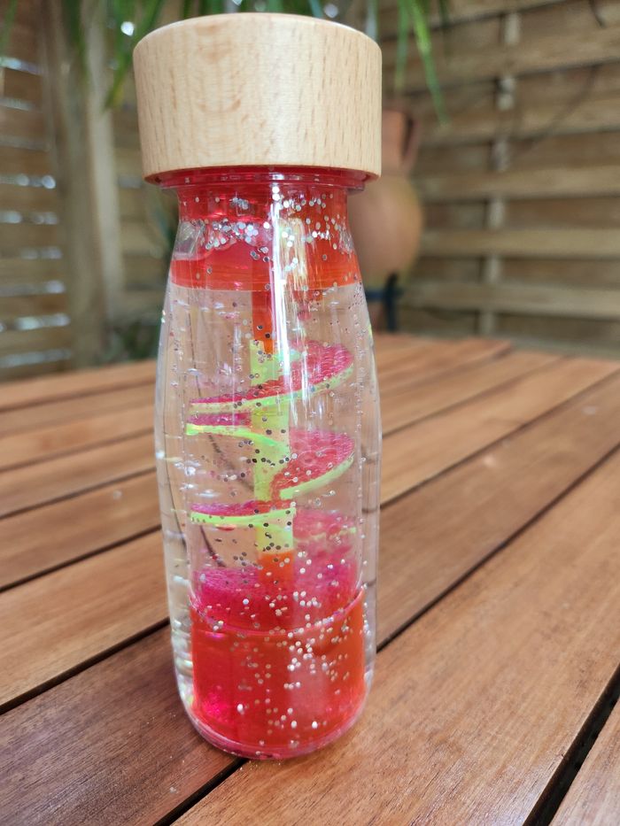bouteille sensorielle rose système de goutte à goutte qui tombe lentement sur un toboggan
