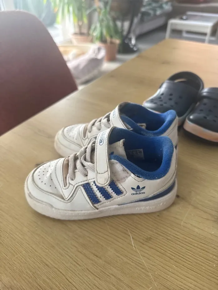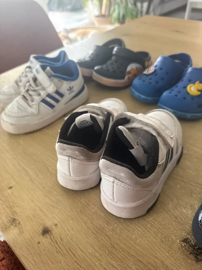 Taille 25 Pour garçon 2 paires de crocs 1 paire de chaussons fermés Mickey 1 paire d’adidas blanc et bleu 1 paire de adidas blanc et noir En très bon état général Le lot complet de chaussures, basket, crocs, chausson