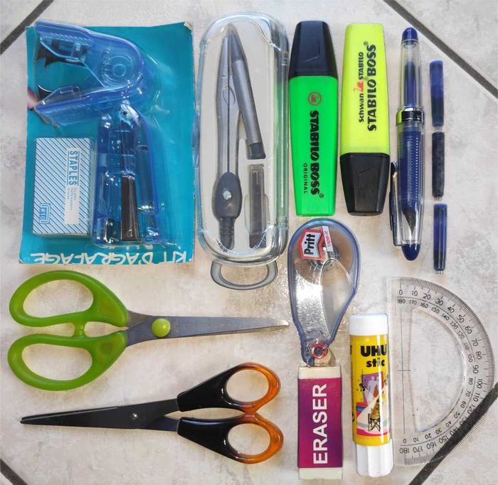 ✏️✂️ Petit lot écolier ✏️✂️ Fournitures scolaires - 1 agrafeuse avec agrafes et arrache agrafe (neuf) - 1 compas + mines (neuf) - 1 petit rapporteur - 2 paires de ciseaux - 1 surligneur vert - 1 surligneur jaune - 1 bâton de colle - 1 Pritt tape_it - 1 stylo encre avec 3 cartouches - 1 gomme Articles d'occasion (hormis agrafeuse et compas) .