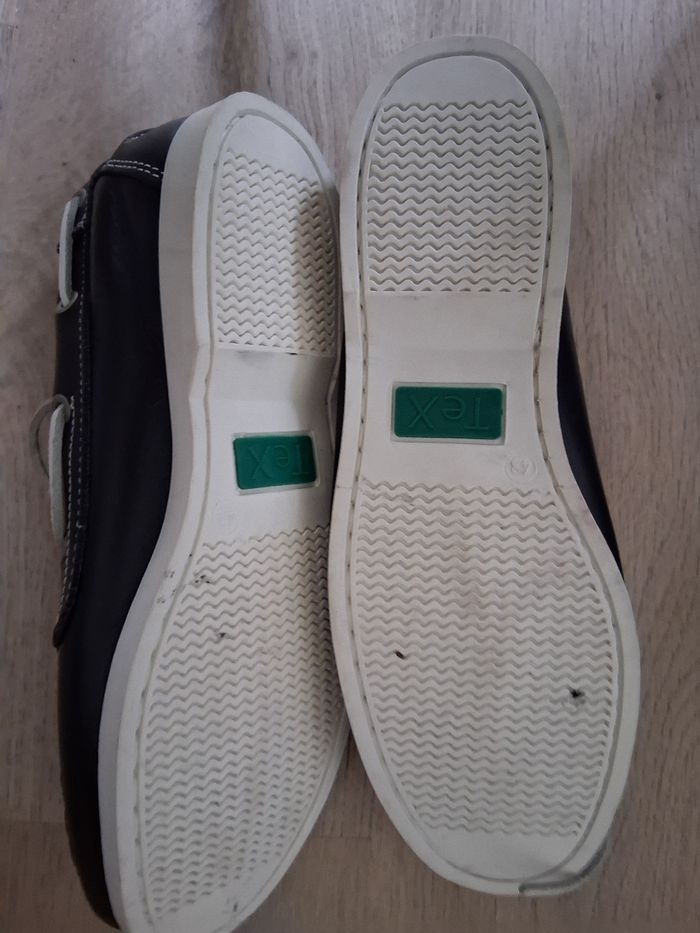 Mocassin bateau " tex" avec lacet. En cuir véritable Bleu marine et blanc Pointure : 43 Longueur semelle extérieure : 29.5 cm État neuf avec étiquette
