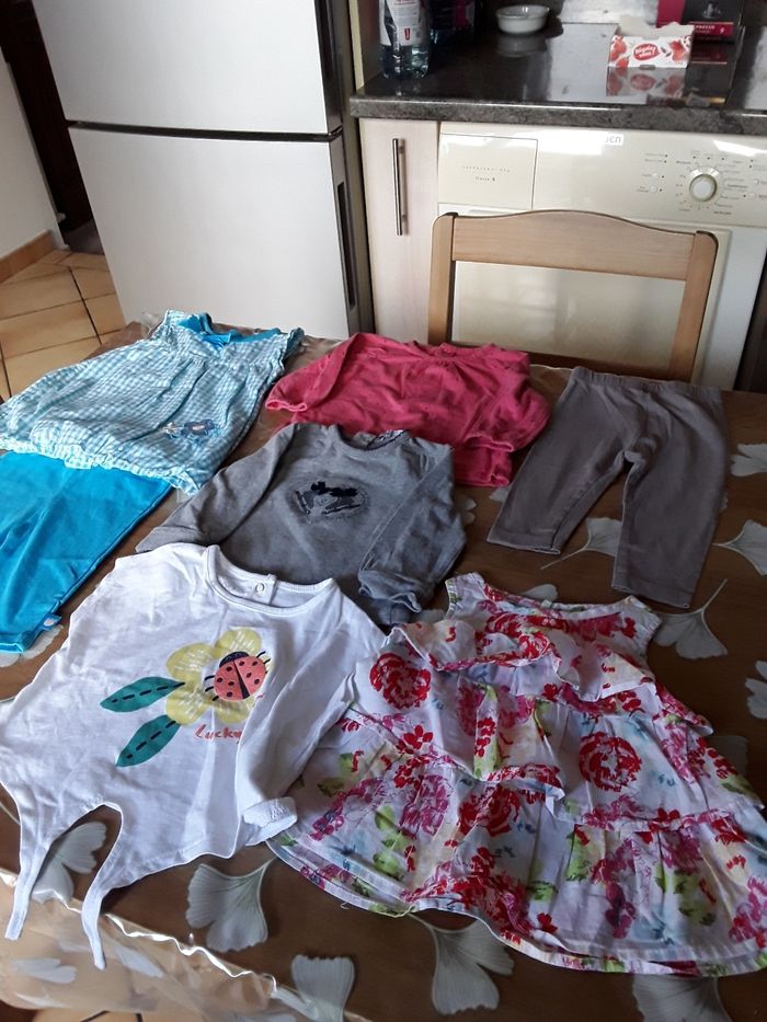 Lot de vetements fille 6 mois 1 t shirt rose a pois manches longues 1 t shirt gris motif patins manches longues 1 t shirt blan sans manche motif coccinelle 1 leeging marron clair 1 robe a volants sans manche motif fleuri 1 leeging turquoise avec tunique a carreaux Soit 0,50e piece