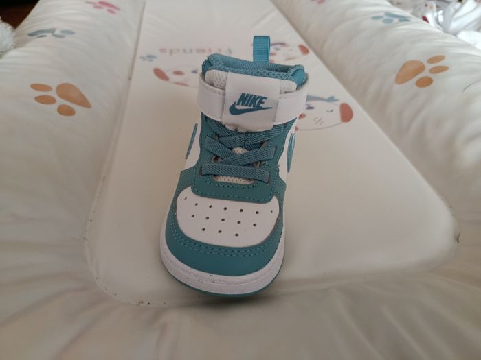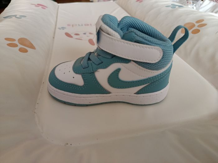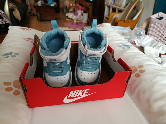 Baskets Nike montantes blanche et turquoise neuves! Jamais portées car devenu trop petite entre l'achat en prévision d'un changement de pointure et aujourd'hui. La boîte est en revanche un peu abîmé car un petit enfant a jouer avec quelques jours.