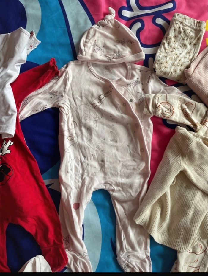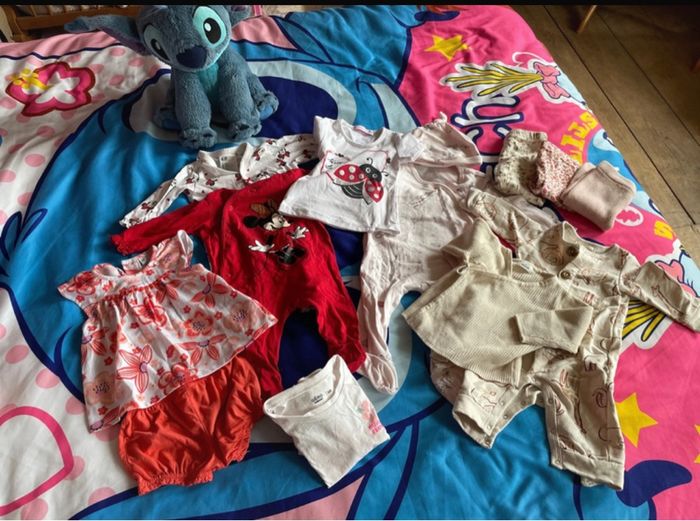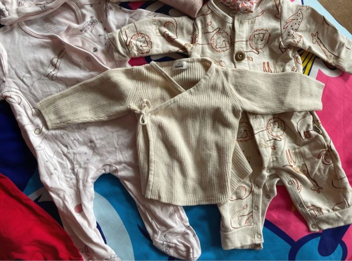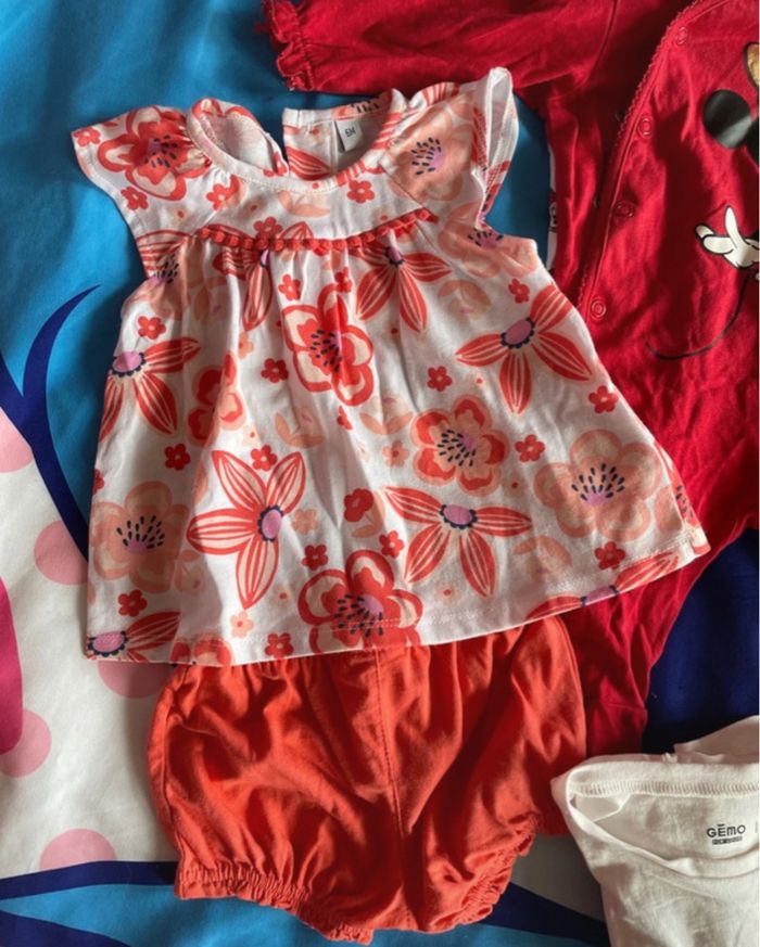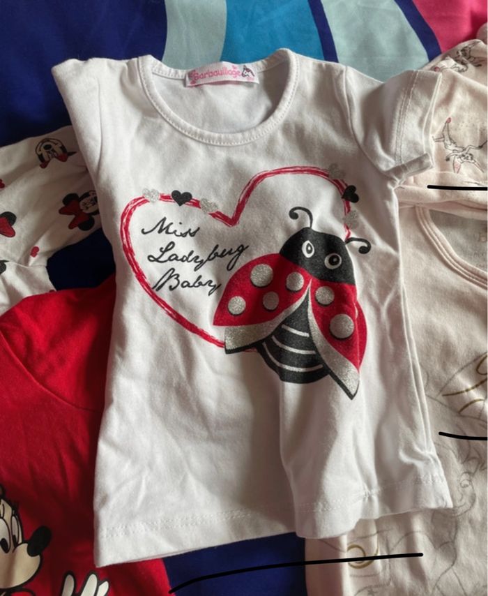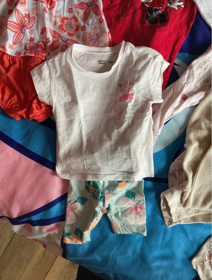 Lots de vêtements 3 pyjamas 3 leggings Un t-shirt un bas Une tunique fleurie avec son bas orange Un gilet cache cœur Un t-shirt blanc avec une coccinelle Taille 3/6 mois ou 6 mois Certains des vêtements n’ont pas été porté ou très peu
