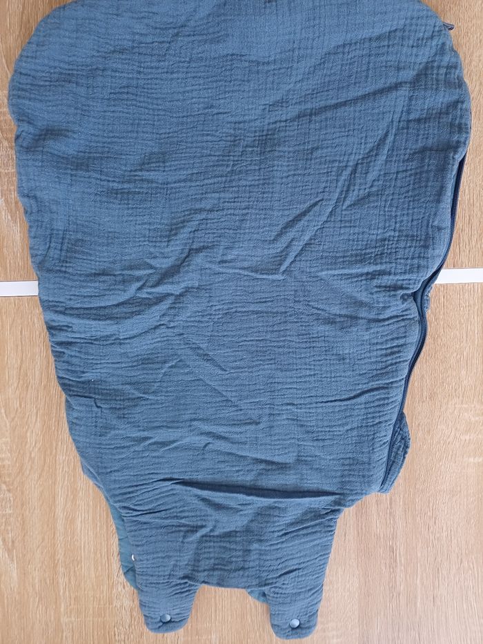 Gigoteuse d'hiver bleue avec texte, tog 2. Fermeture sur le côté et bouton pression au niveau du cou. Taille 0-6 mois. Bon état Marque: Kiabi