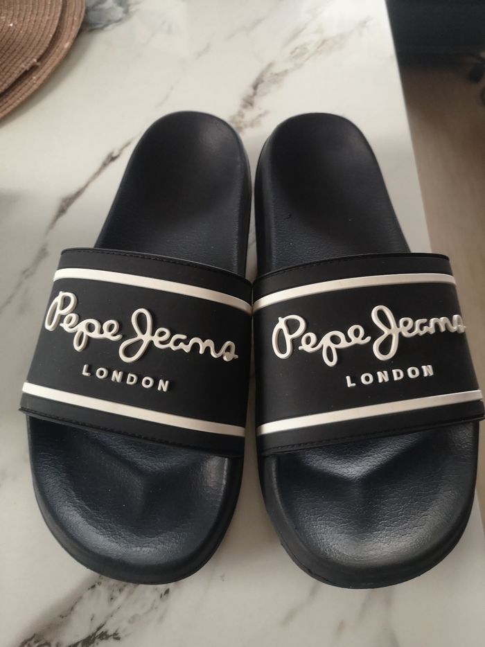 🔥 Claquette Pepe Jean ORIGINAL 🔥 Taille: 40 📏 Parfait état✅ Prix: 20€ 💰 Aucun défaut, comme neuf. Porté 1 journée seulement la taille ne me conviens pas. Point fort: 👉 Confortable, élégant et idéal pour l’été. Belle opportunité à saisir ! Envoie rapide et soigné 📦📦📦