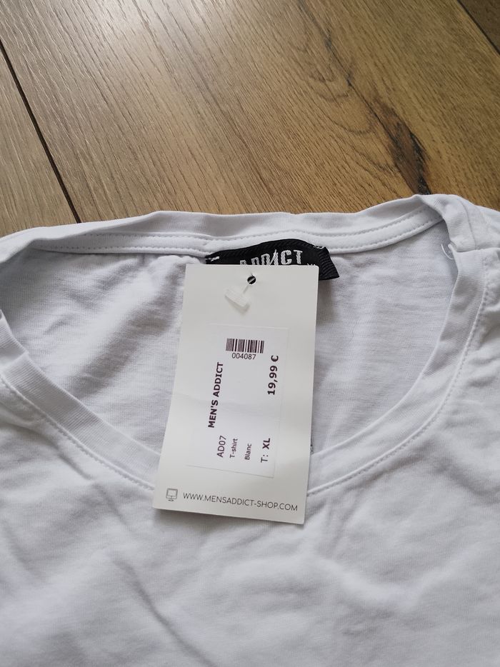 ATTENTION : BIEN LIRE L'ANNONCE AVANT ACHAT. T-shirt pour homme blanc et noir, uni, manches courtes, coupe arrondie sur le bas. Attention ce modèle a une petite tache dans le dos. Elle est assez discrète, d'où le prix. Le prix n'est pas négociable. Taille : Étiqueté en XL mais correspond plus à du L. Marque : Mentex Mesure dessous de bras à dessous de bras : 47cm Ce modèle est neuf avec étiquette. Le prix vendu en magasin est de 19,99€ Ad007 blanc xl N°2