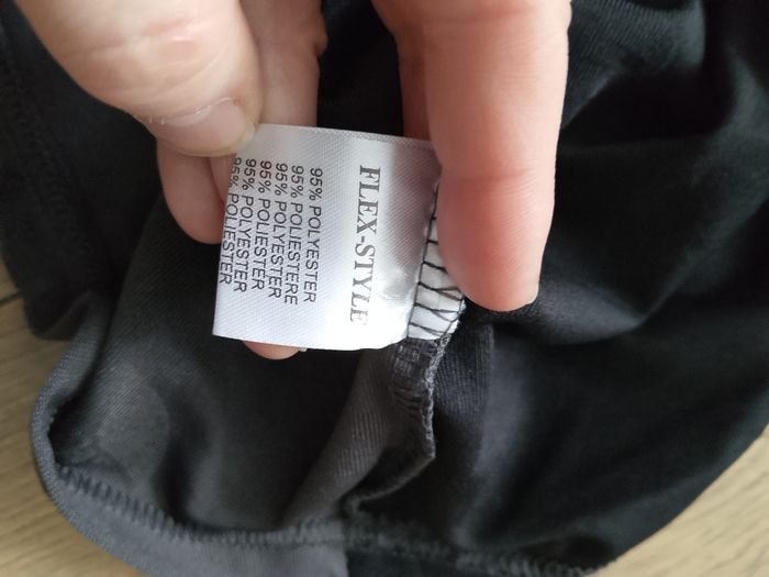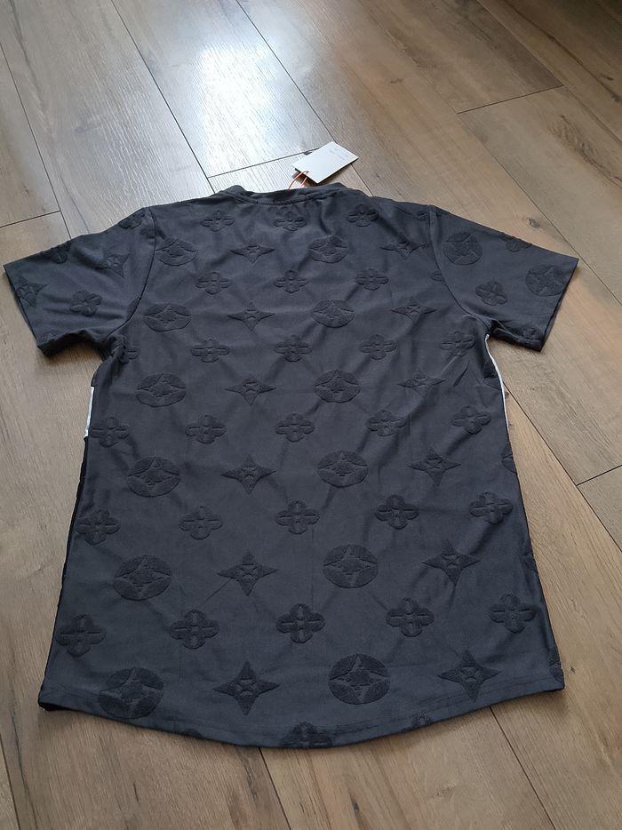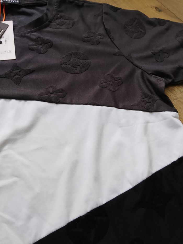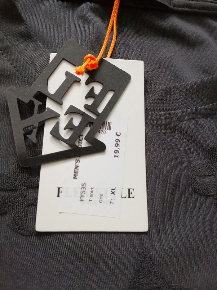 T-shirt gris blanc et noir manches courtes pour homme. Motifs dans le tissu. Coupe droite sur le bas. Taille : Étiqueté en XXL mais correspond plus à du XL. Marque : FlexStyle Mesure dessous de bras à dessous de bras : 52 cm Article neuf avec étiquette. Vendu en magasin au prix de 19,99€. Fy535 gris XL N°2