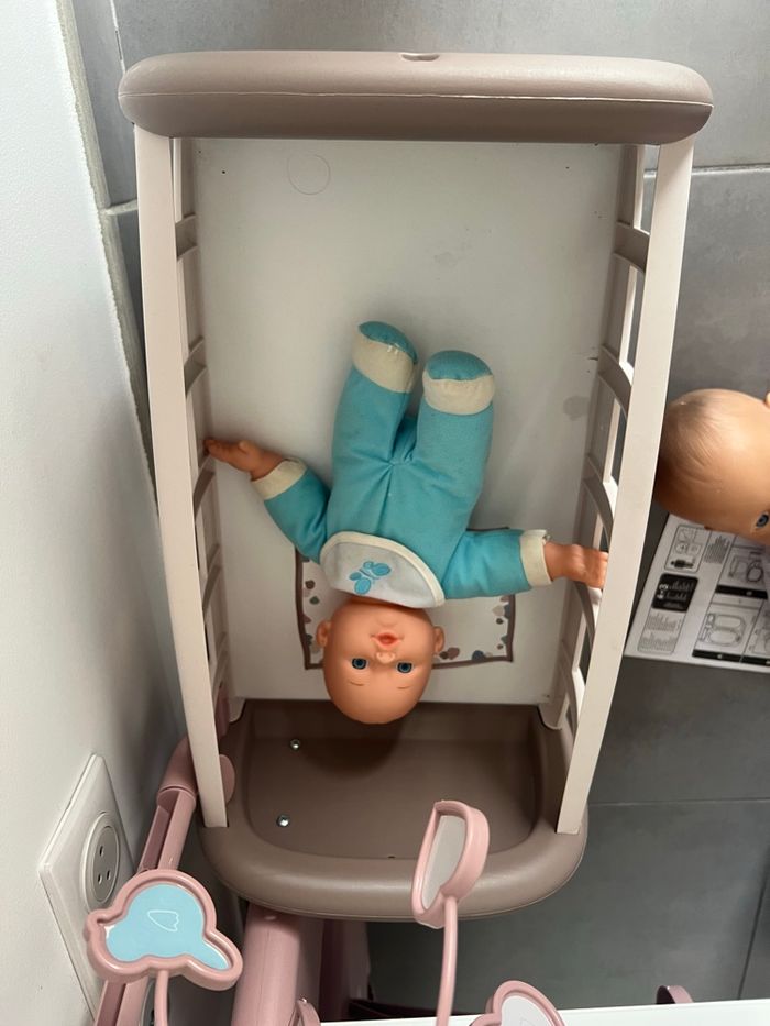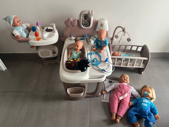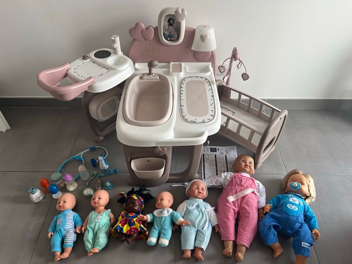 Nurserie smoby en excellent état sauf un accro dans le lit voir photo Avec 7 poupons dont un cicciobello (qui ne fonctionne pas mais très mignon) et quelques accessoires de puériculture (voir les photos)