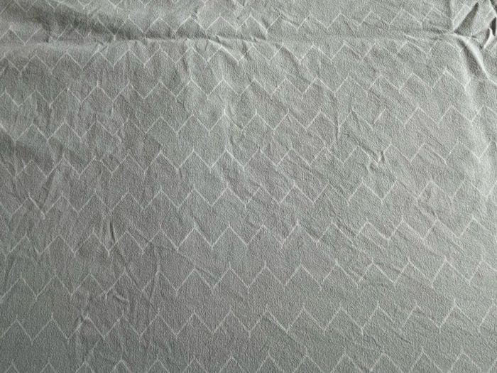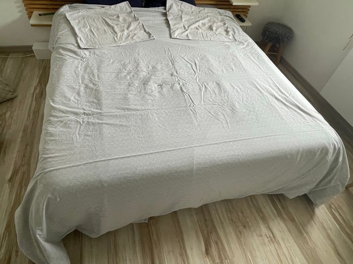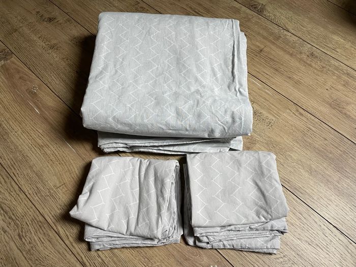 Parure de lit comprenant une housse de couette en taille 260x240cm et 2 taies d’oreillers 65x65cm. Couleur gris avec des traits blancs. En très bon état.