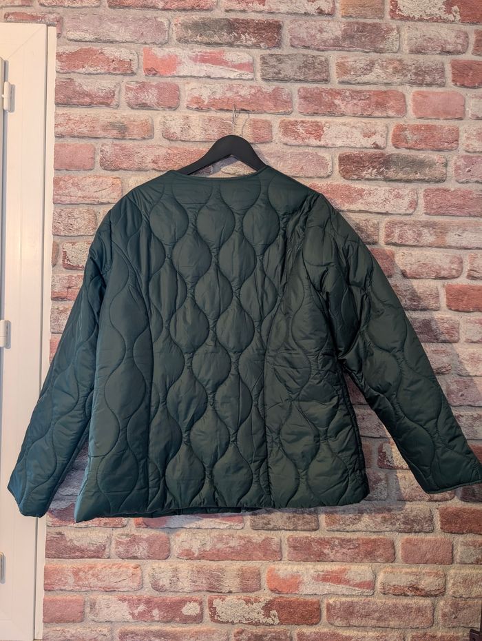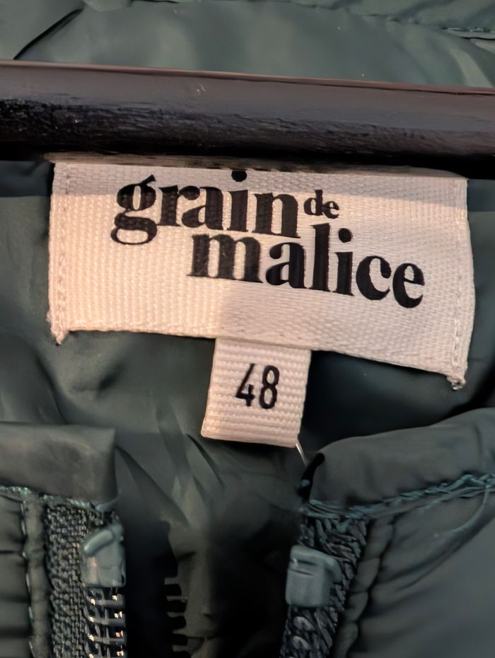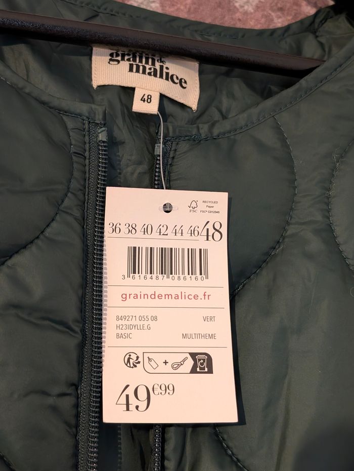 Blouson femme mi-saison marque grain de malice Taille 48 Coloris vert Mesure épaule à épaule 46cm Mesure aisselle à aisselle 63cm Longueur totale du blouson 69 cm Blouson fermer par fermeture éclair De poche latérales avec zip