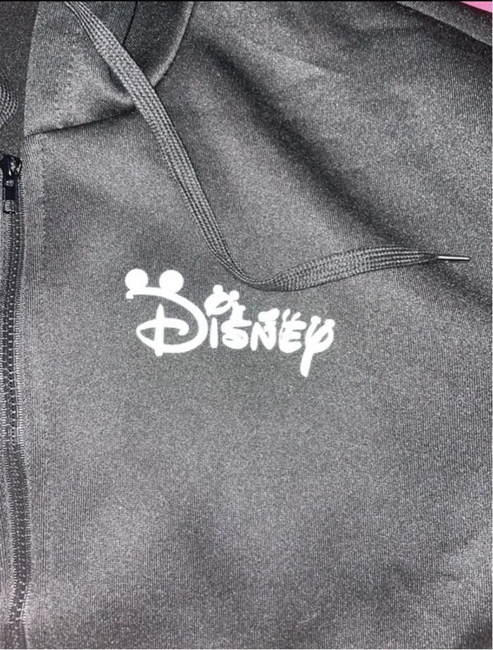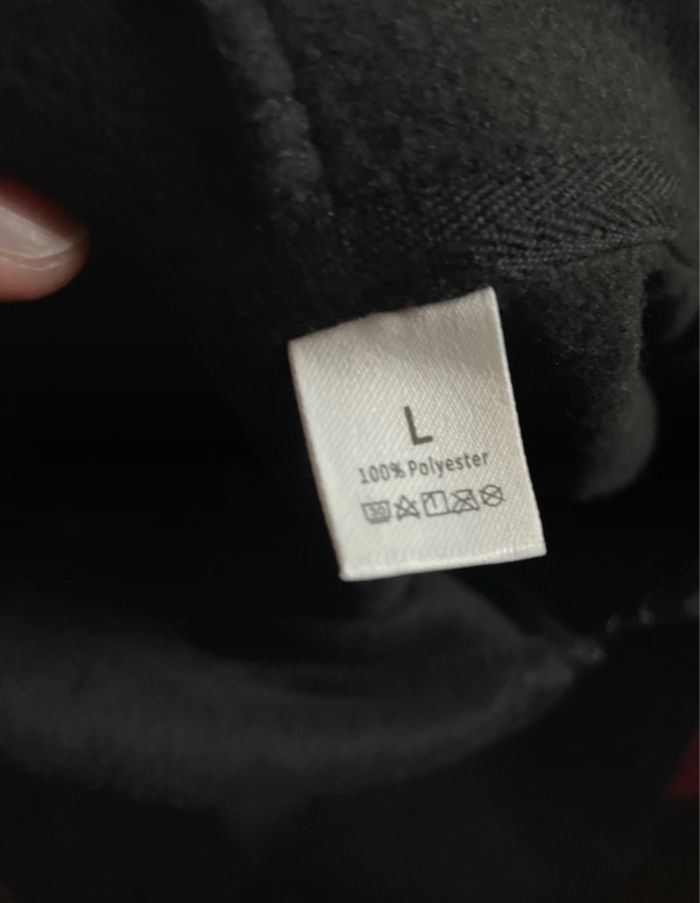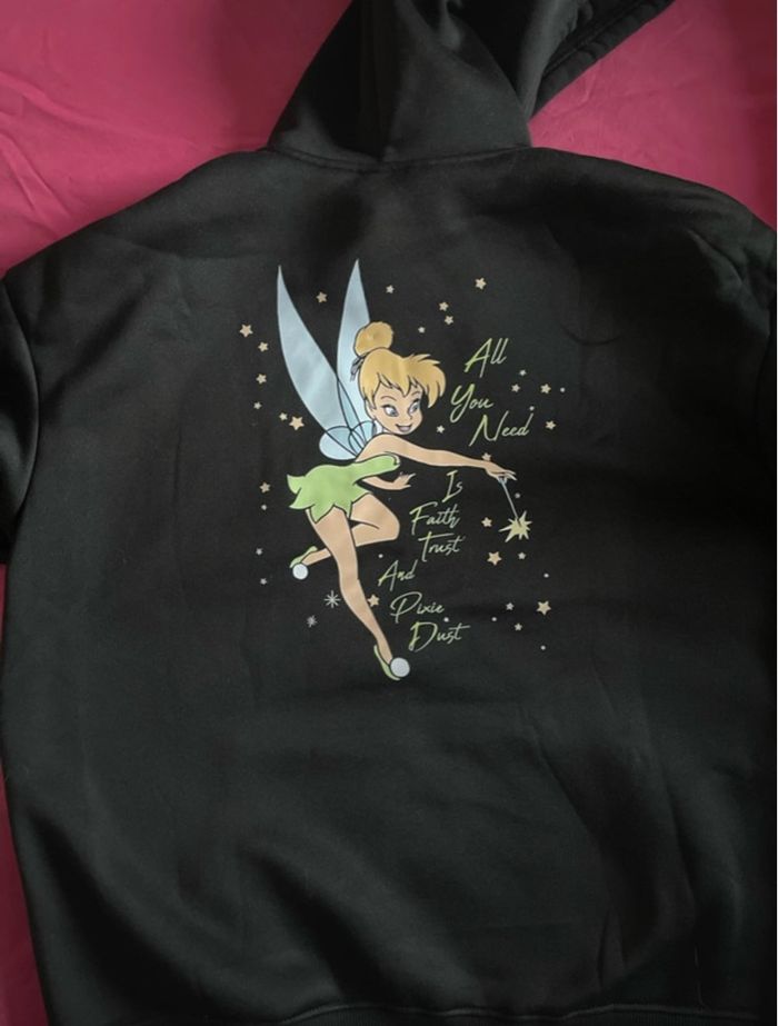 Veste noire fermeture éclaire Deux poches Fée clochette au dos Taille L mais correspond plutôt à un taille M Je mesure 1m75 et la longueur des manches est trop juste d’où sa mise en vente Neuve