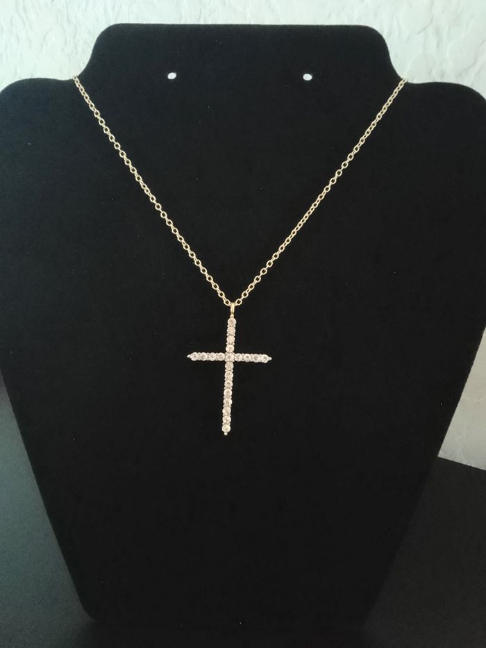 Chaîne + pendentif religieux. Pendentif : croix, strass. (religieux, spirituel, protection, bohème, élégant, idéal cadeau) DESCRIPTIF : Couleur : doré. Taille chaîne : 41 cm + 5 cm Diamètre pendentif : 3 cm L * 4,5 cm H Envoi rapide et soigné.
