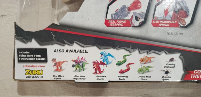 Robo Alive T-Rex, neuf sous emballage. Informations notées sur l'emballage: - Marche comme un véritable T-Rex ! - Action de morsure réelle avec lumière ! - Arme intégrée ( fictive bien sûr !) - Armure épique amovible Inclus dans le contenu: - 1 Dino Wars T-Rex - 1 notice